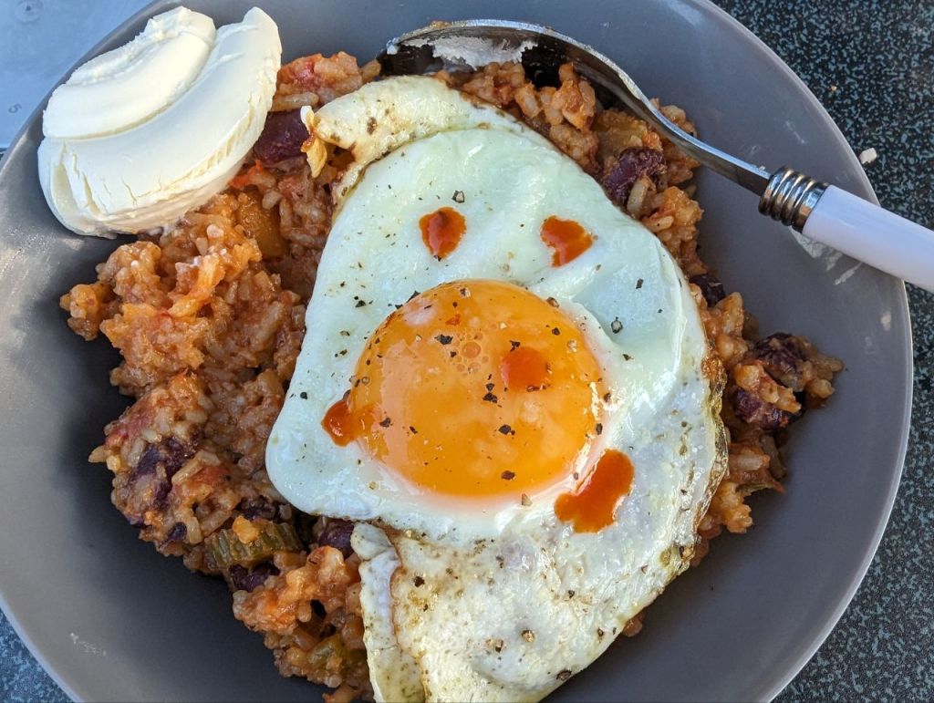 Wir fahren zurück. Zu Essen gibt’s Reis mit Bohnen, Spiegelei und Frischkäse.