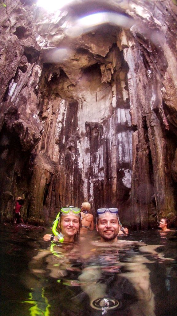 Außerdem machen wir eine Tour zu der Höhle / Grotte Sawa-i-Lau-Caves. Diese besteht aus einer Höhle, welche oben offen ist und aus einer stockdunklen geschlossenen Höhle. Hierfür müssen wir unter Wasser durch den Eingang tauchen.