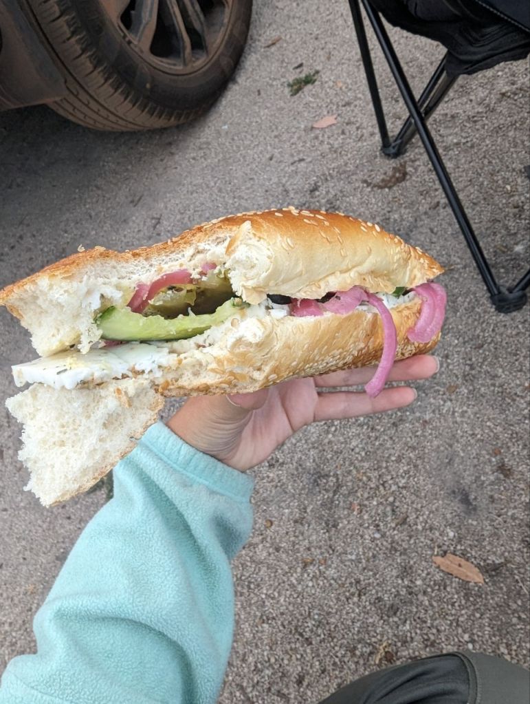 Am späten Nachmittag erreichen wir den Campingplatz. Unser Stellplatz ist leider nicht so toll, weil mittendrin, aber halb so schlimm. Abends essen wir belegtes Baguette.
