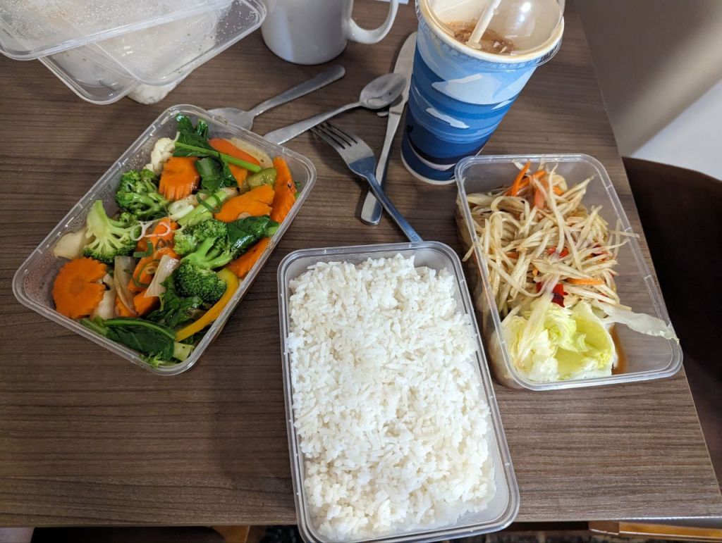 Mit dem Taxi geht’s zurück und wir holen uns nochmal beim Thai Essen. Mira hat Oyster Stir Fry, Fabi grünen Papayasalat. Sehr lecker, aber wirklich richtig scharf. Auf jeden Fall authentisch. Außerdem gibt es wieder Milk Tea und Sticky Rice mit Mango.