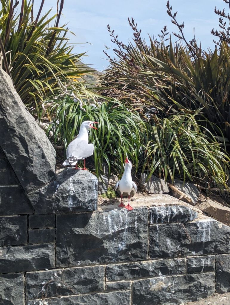 Vom Café aus sieht man Schafe grasen und hunderte Möwen. Wir entdecken sogar zwei Albatrosse, riesige Vögel.