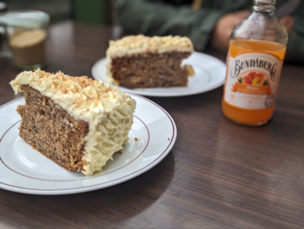 Wir gehen in das Café im Gebäude und essen beide ein Stück Kuchen. Ein großes Stück.
