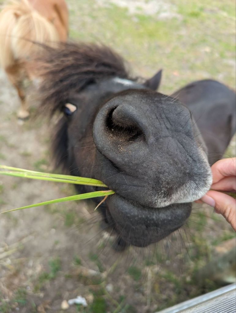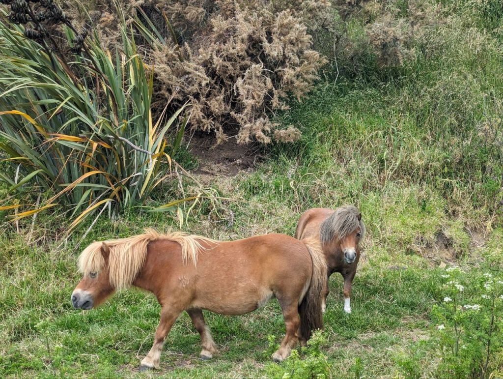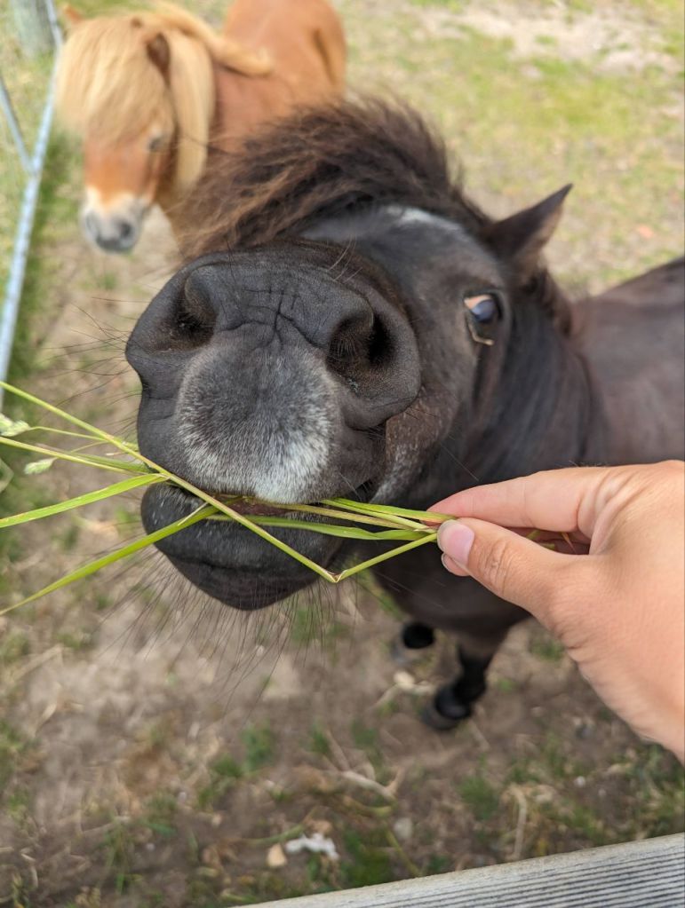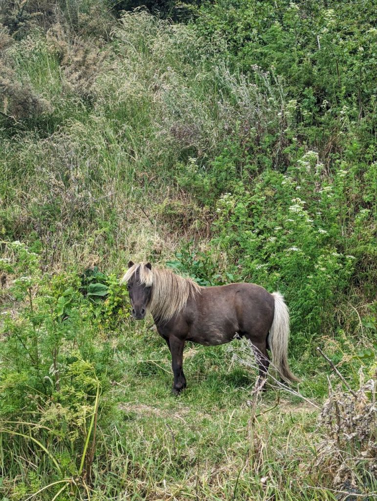 Auf dem Rückweg halten wir noch bei einigen Ponys (vermutlich Shetlandponys), Mira hat sie ein bisschen lieb und kommt klettenübersät zurück.