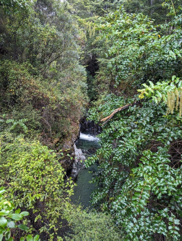 Leider ist der Fluss sehr voll, daher haben wir keinen perfekten Blick. Auf der anderen Flussseite kommen wir auf Schotterstraße, aber kein Weg führt zum Fluss, alles Weideland.