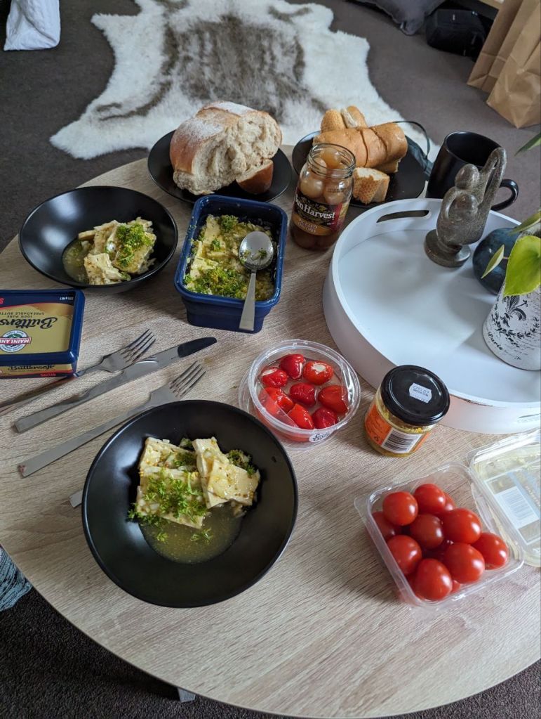 Zu Essen gibt es eingelegten Camembert + Brie und Brot.