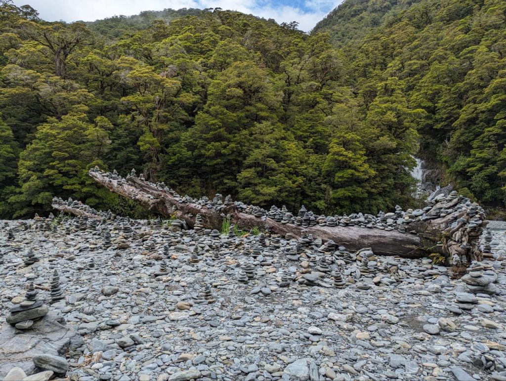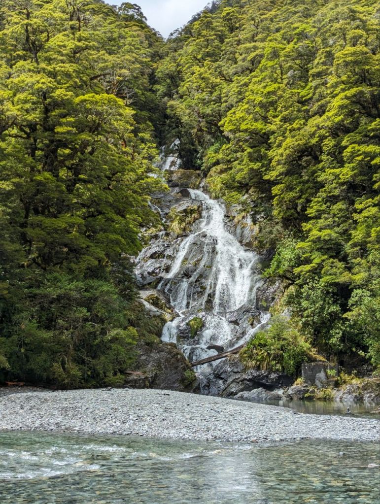Wir halten an den Fantail Falls und Thunder Creek Falls. Die Luft ist sehr feucht und kühl, die Straße abenteuerlich und die Sandfliegen sind zu Hauff zurück.