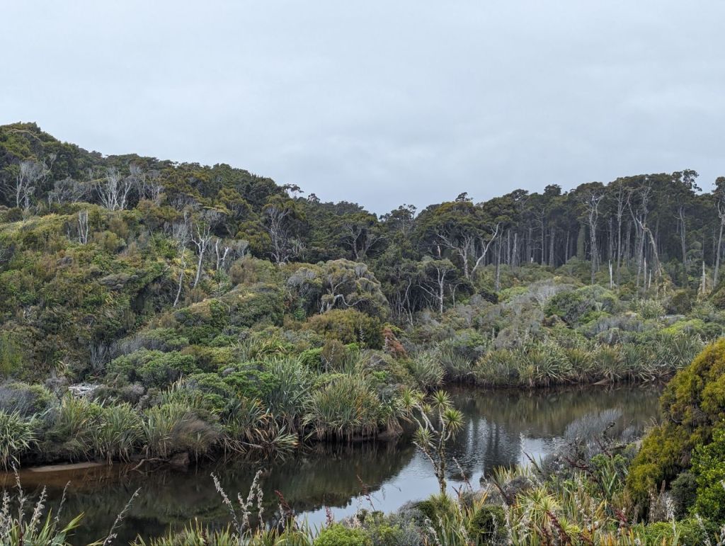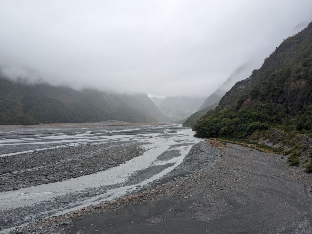 Zum Ende wird die Landschaft wieder bergiger. Wir laufen noch einen kurzen Weg zum Franz-Josef (war mal) Gletscher. Durch den Nebel sehen wir wenig, aber auch sonst ist er nur noch klein, da er in den letzten Jahren weggetaut ist. Außerdem geht der Weg nicht mehr, wie damals, weiter über das Flussbett, da es zu gefährlich ist. Aussicht ist trotzdem schön.