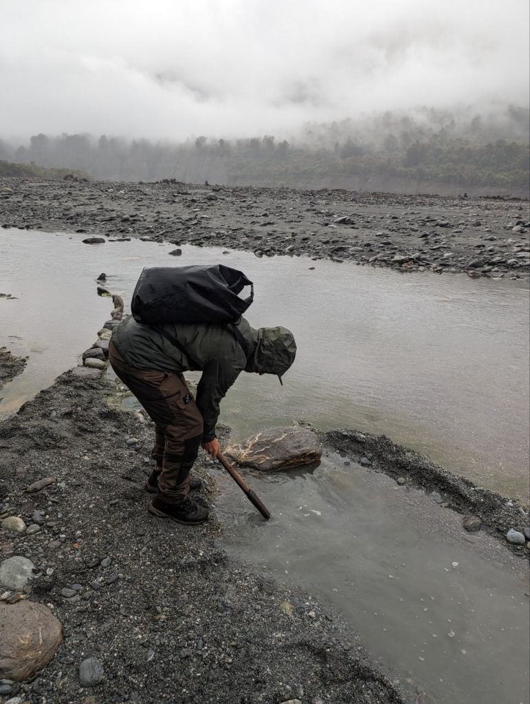 Wir drehen um und überqueren das Flussbett, durch Steintürmchen finden wir endlich den Eimer und Schaufeln und kurz danach: die dampfenden heißen Quellen und keine Menschenseele.