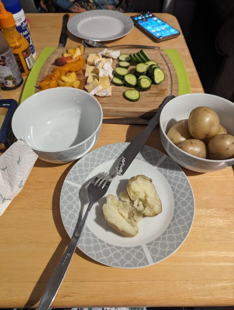 Zurück in der Hütte gibt’s Pellkartoffeln mit allerlei Resten.