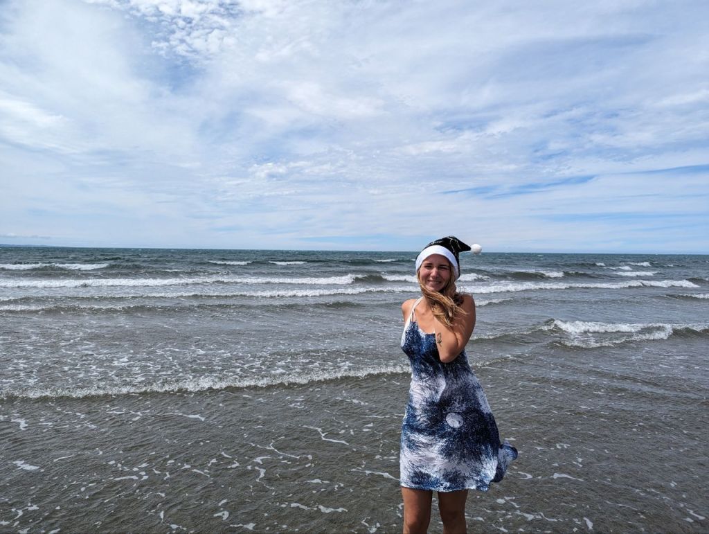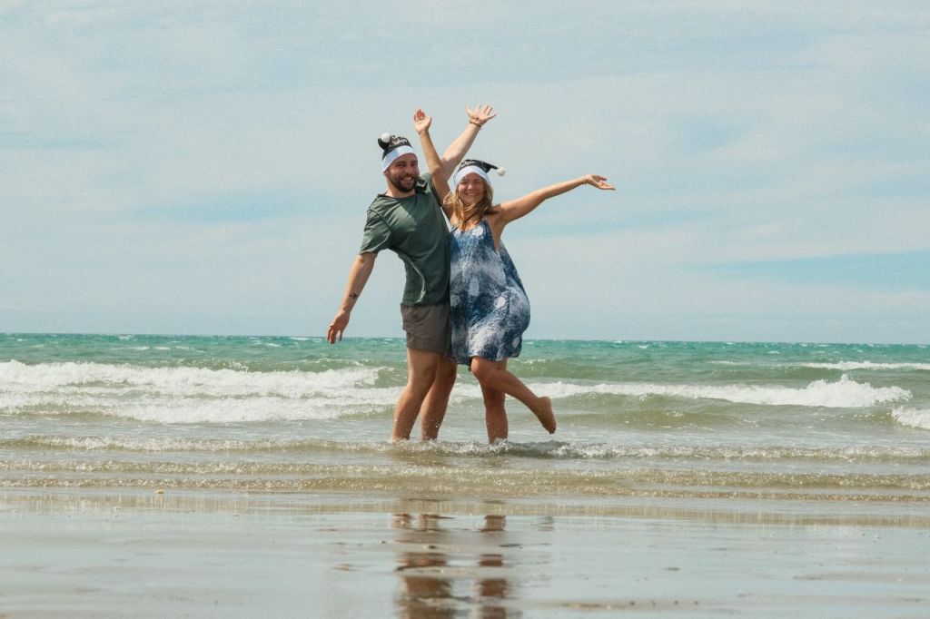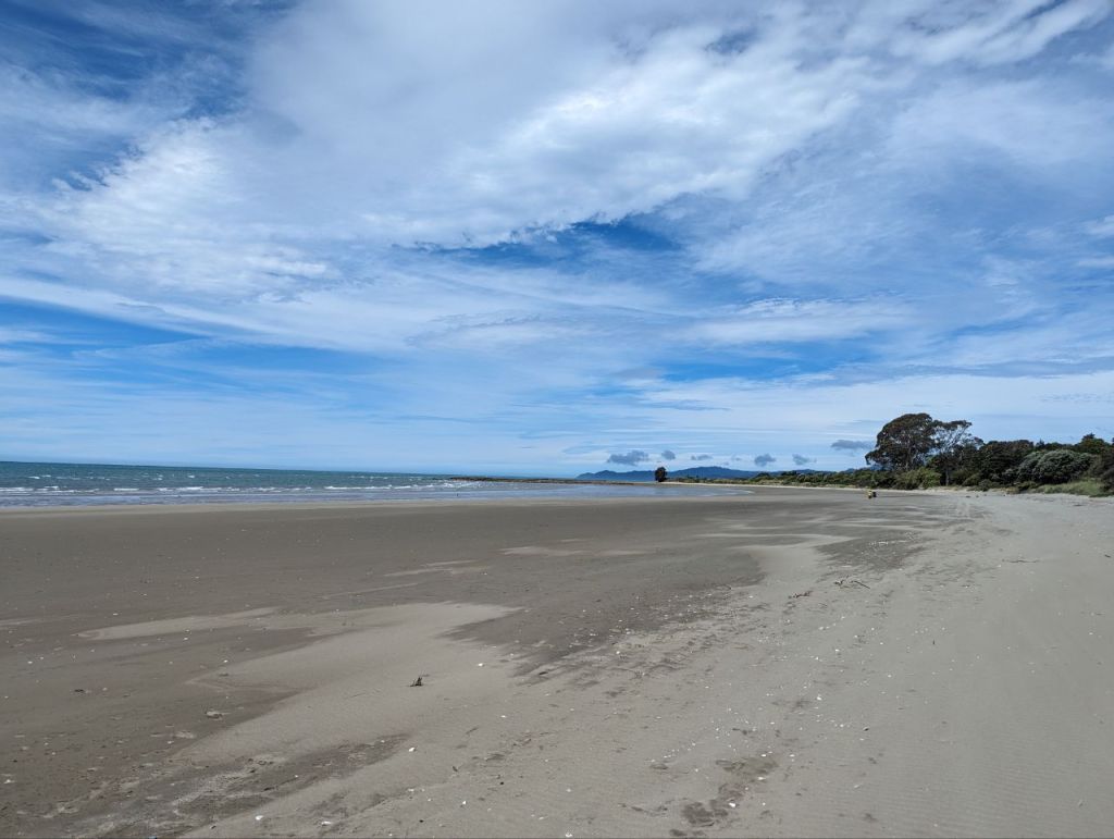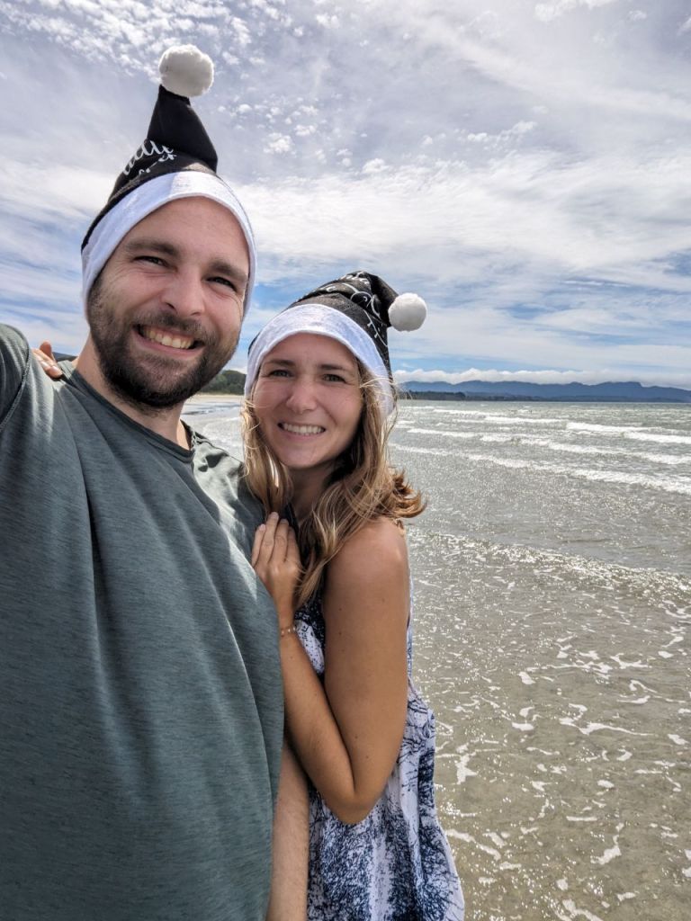 Am Strand ist es windig, aber trotzdem warm. Wir springen ins Meer – ein echtes neuseeländisches Weihnachten! Die tasmanische See ist angenehm und nicht kalt.