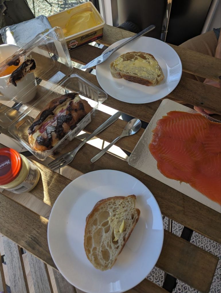 Als Weihnachtsfrühstück gibt es heute Räucherlachs und einen Cream Doughnut.