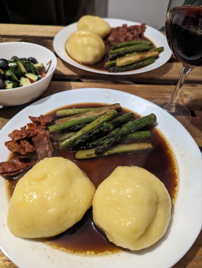 Es gibt endlich, nach so vielen Monaten, Knödel! Dazu grünen Spargel, Pilzsoße und Fake-Speck. Yummy!