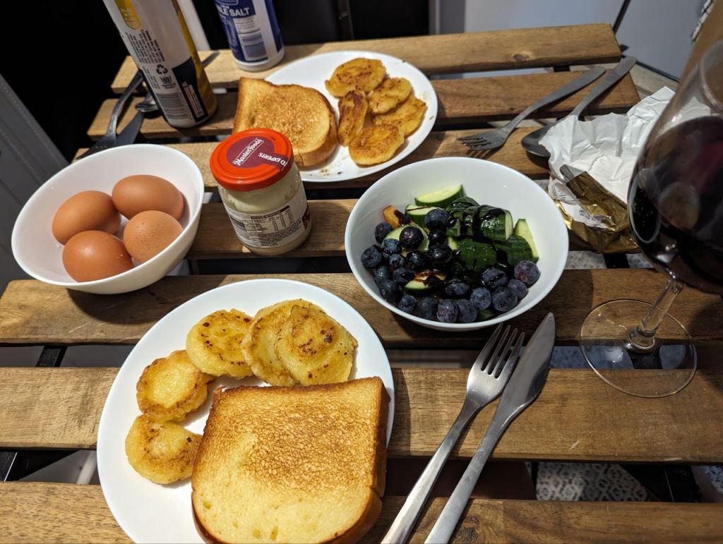 Abends gab es Reste in Form von Kartoffeltalern, Eiern, Toast und Käse. Und natürlich Wein.