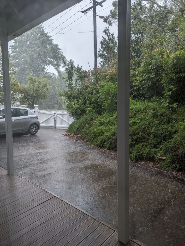 In einer kurzen Regenpause gehen wir einkaufen, es schüttet aber schnell wieder aus Eimern.