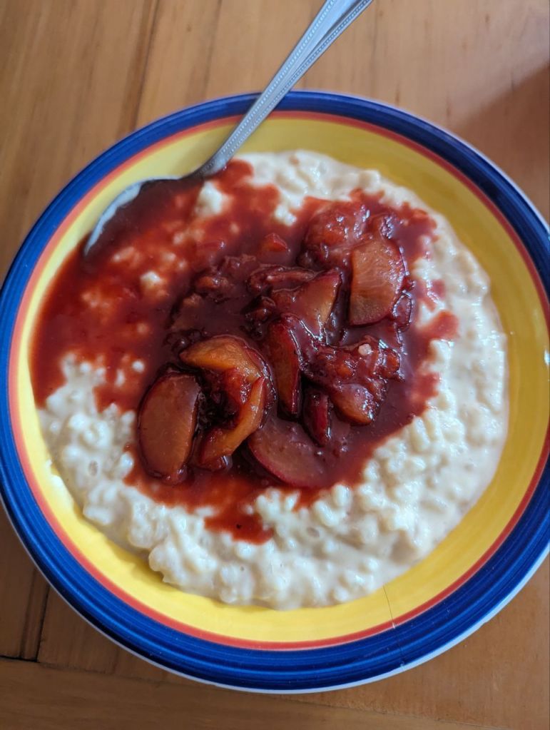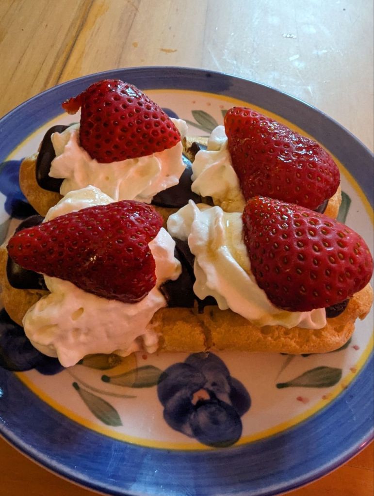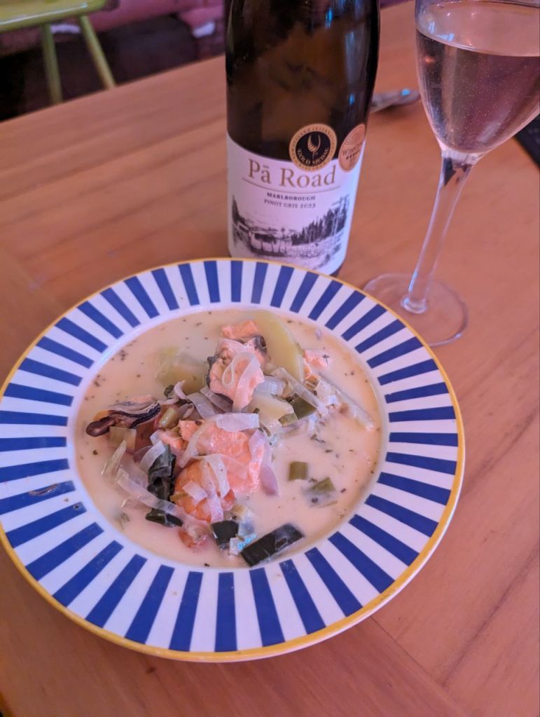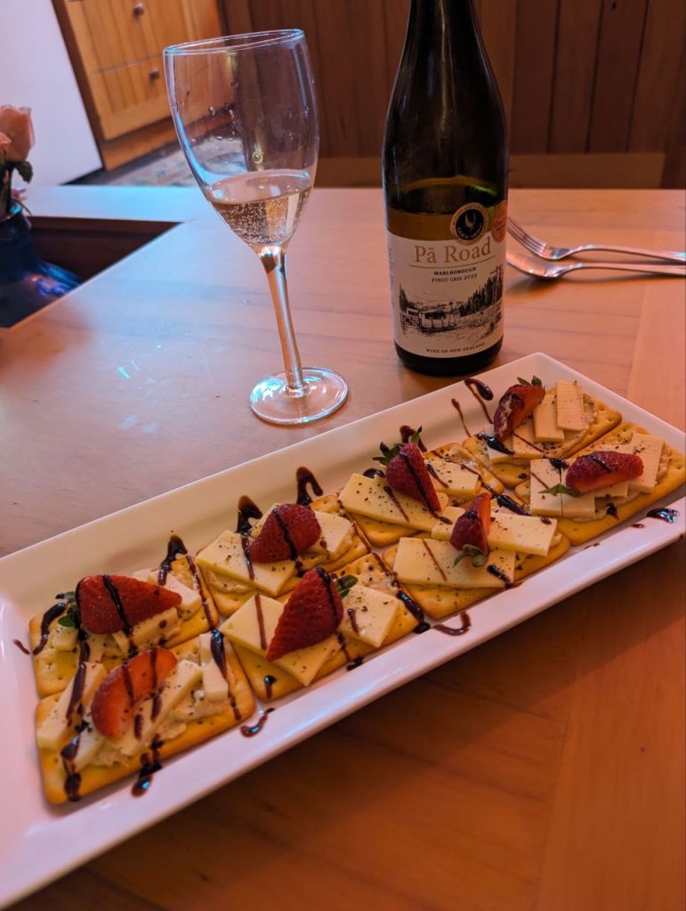 Abends gibt’s ein Vier-Gänge-Menü, gehört sich so an Silvester. Käseauswahl als Vorspeise, dann eine White Bouillabaisse als Hauptgericht. Danach zwei Nachspeisen. Eclairs mit Sahne und Erdbeeren und Brookies mit Toppings.