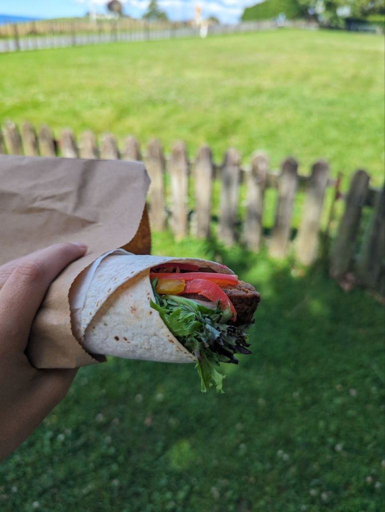 Am Filmset angekommen holen wir unsere Tickets ab und überbrücken die Wartezeit mit Falafel Wraps.