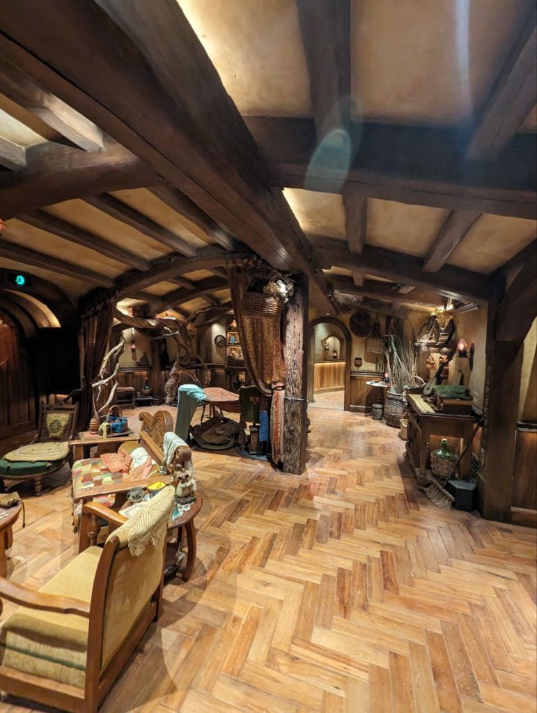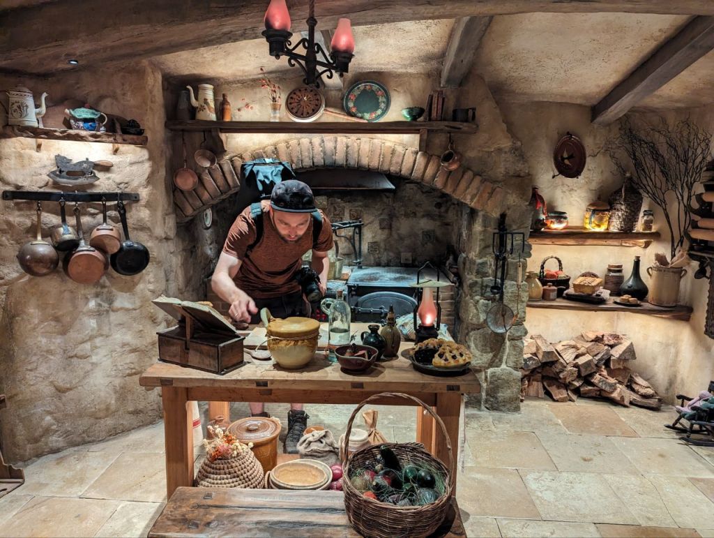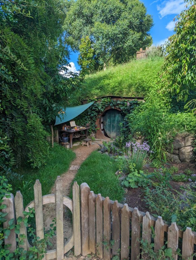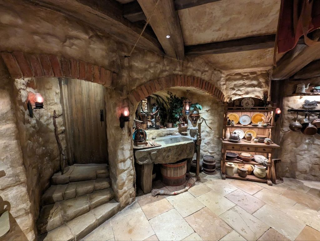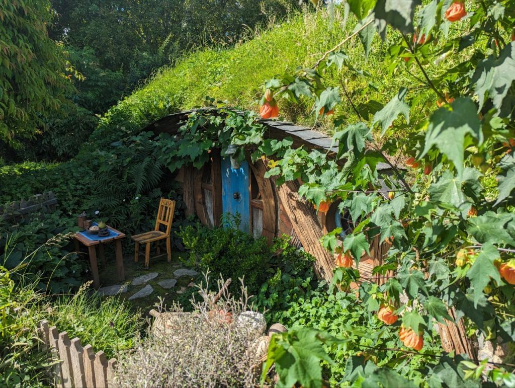 Gleich nebenan teilen wir uns noch mal in zwei Gruppen auf, denn es wartet eine Besonderheit auf uns. Im Dezember 2023 wurden zwei neue Hobbithöhlen fertiggestellt und zwar komplett mit Innenausbau und Einrichtung. Da haben wir Glück zu den Ersten zu gehören, die in eine Höhle können.