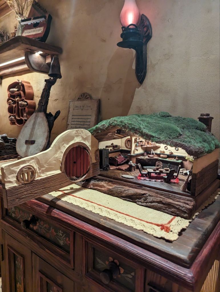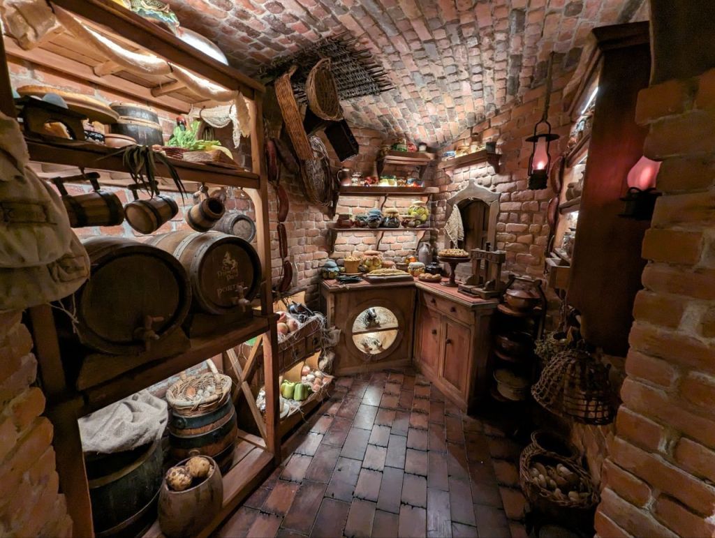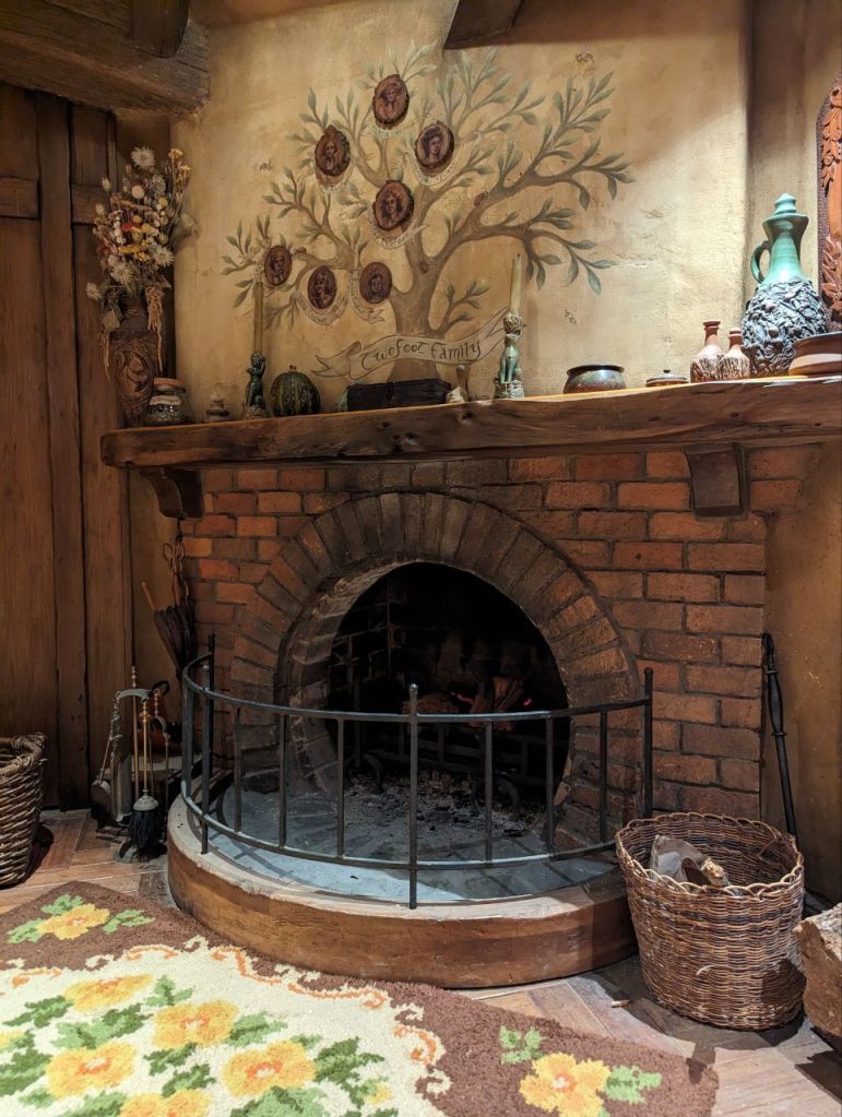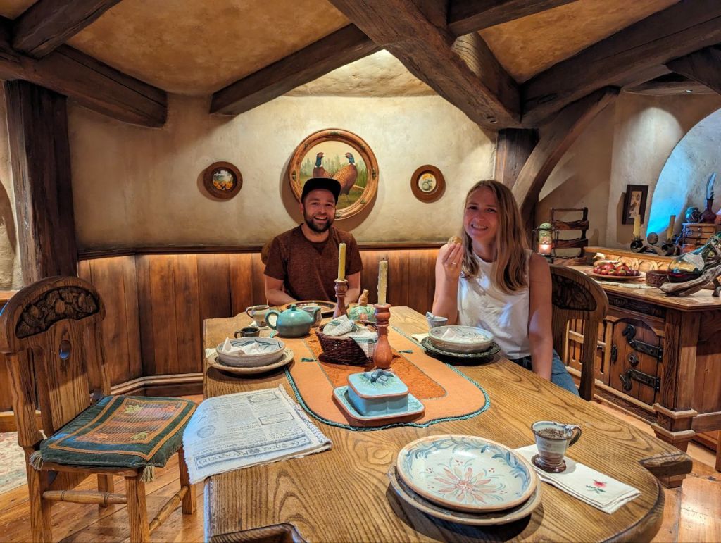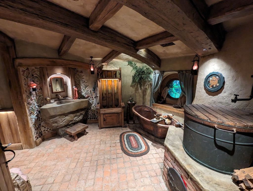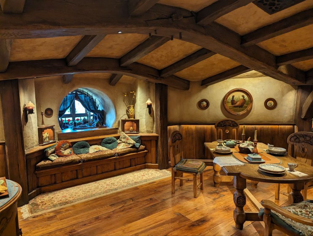 Gleich nebenan teilen wir uns noch mal in zwei Gruppen auf, denn es wartet eine Besonderheit auf uns. Im Dezember 2023 wurden zwei neue Hobbithöhlen fertiggestellt und zwar komplett mit Innenausbau und Einrichtung. Da haben wir Glück zu den Ersten zu gehören, die in eine Höhle können.