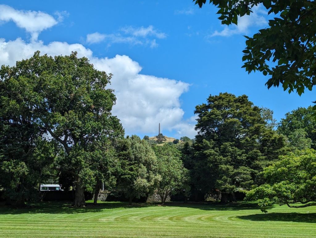 Währenddessen laufen wir hoch zum One Tree Hill Monument. Wir entscheiden uns für den kürzeren, steilen Weg. Von hier aus haben wir einen tollen Blick auf Auckland.