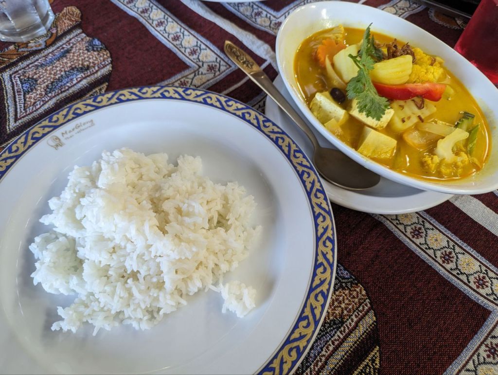 Danach gehen wir thailändisch Essen, Mira hat gelbes Curry, Frabe einen Tofu Salat.