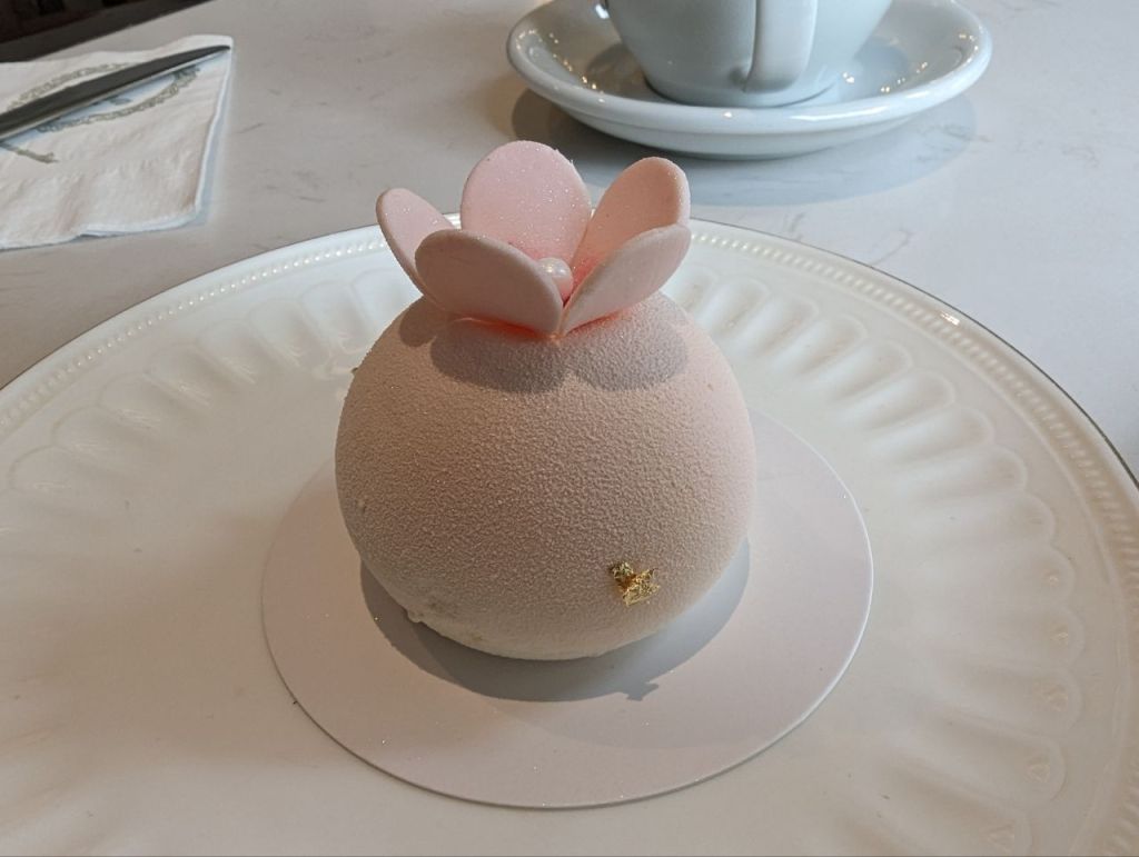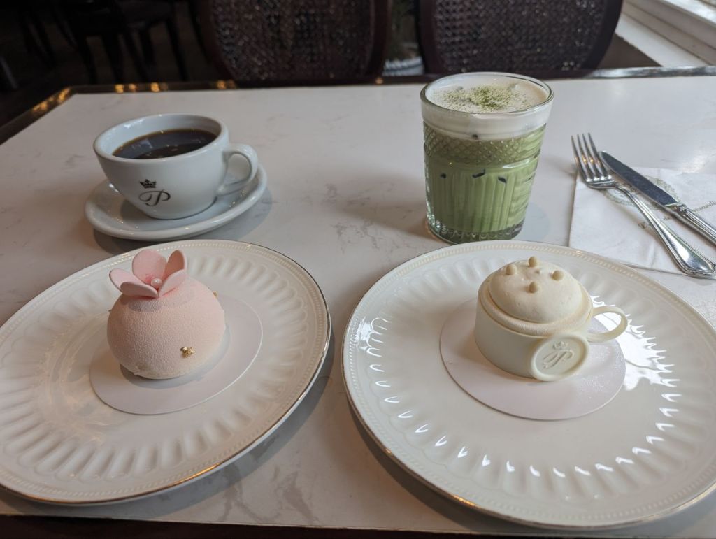 Zuerst gehen wir in eine süße Patisserie und gönnen uns zwei tolle kleine Törtchen, Fabi einen Kaffee und Mira einen Matcha Latte.