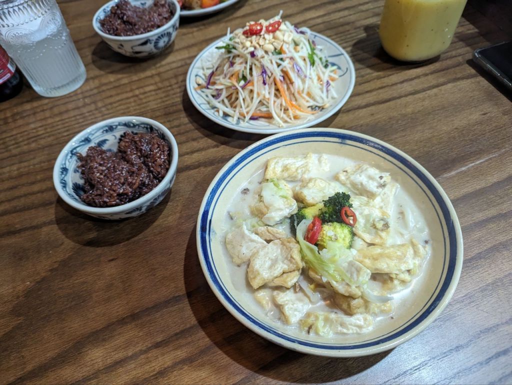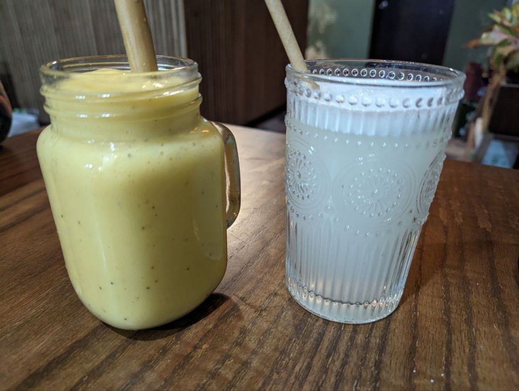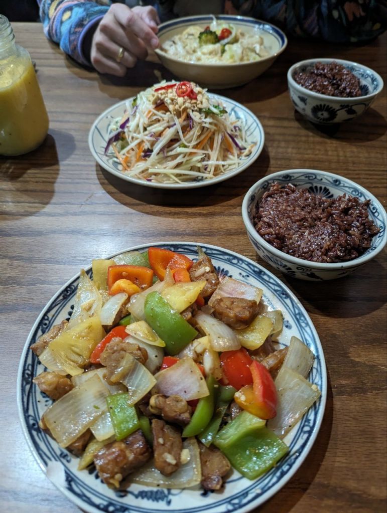 Smoothies, gebratener Tempel, Tofu in Ingwer Kokososse, dazu braunen Klebreis und Papayasalat.