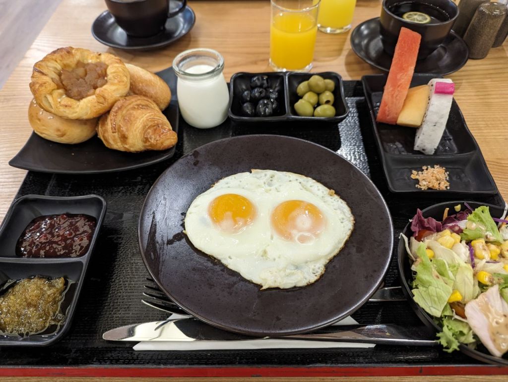 Dieses Mal haben wir das amerikanische Frühstück mit Spiegelei, Salat, Obst, Plunder und Brötchen.