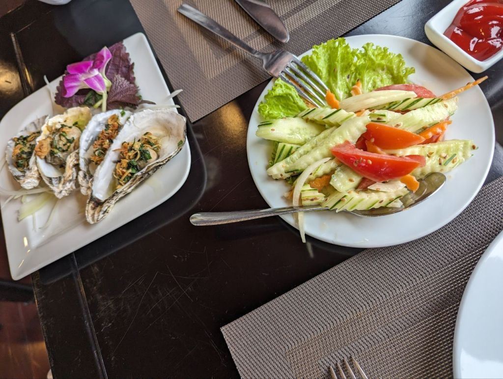 Um 9 Uhr wird ausgecheckt und es gibt Brunch auf dem Boot. Das Brunch hat ca. 17 Gänge, viel zu viel für uns. Es ist hauptsächlich ähnlich dem Mittagessen gestern und uns ein bisschen zu schwer, aber lecker. Es gibt extra Veggiegerichte für uns.