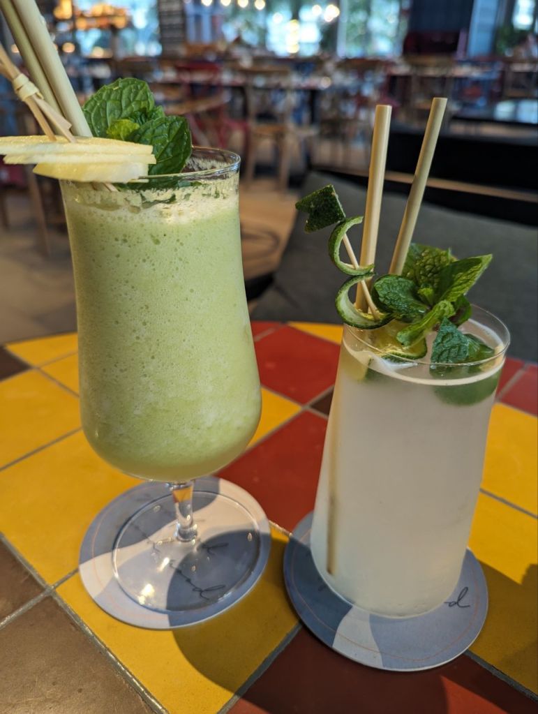 Es hat geöffnet! Wir bestellen uns als Vorspeise sehr leckere Tempura Garnelen. Zu Trinken einen Limettensaft, Guavenschorle und Bier.