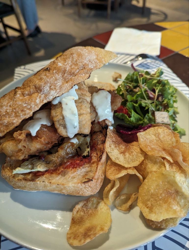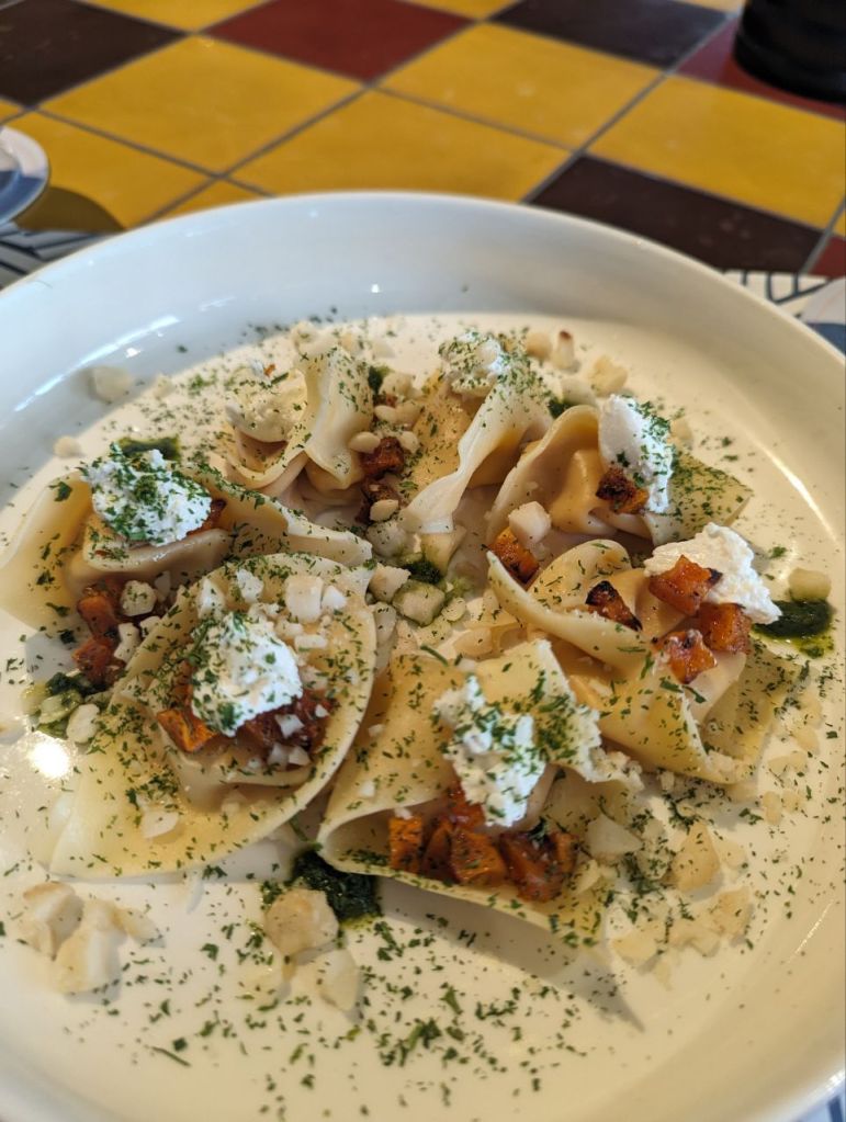 Für Fabi gibt’s einen Tempura Fischburger mit Chips und für Mira mit Kürbis gefüllte Tortellini. Das Essen ist wirklich außergewöhnlich gut.