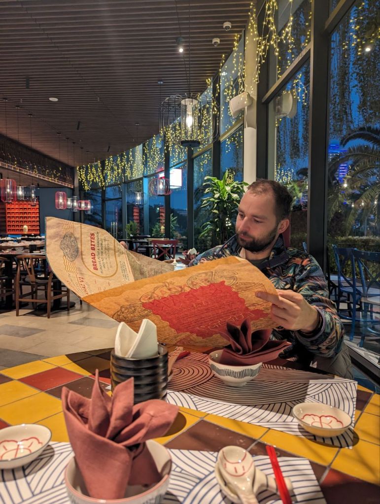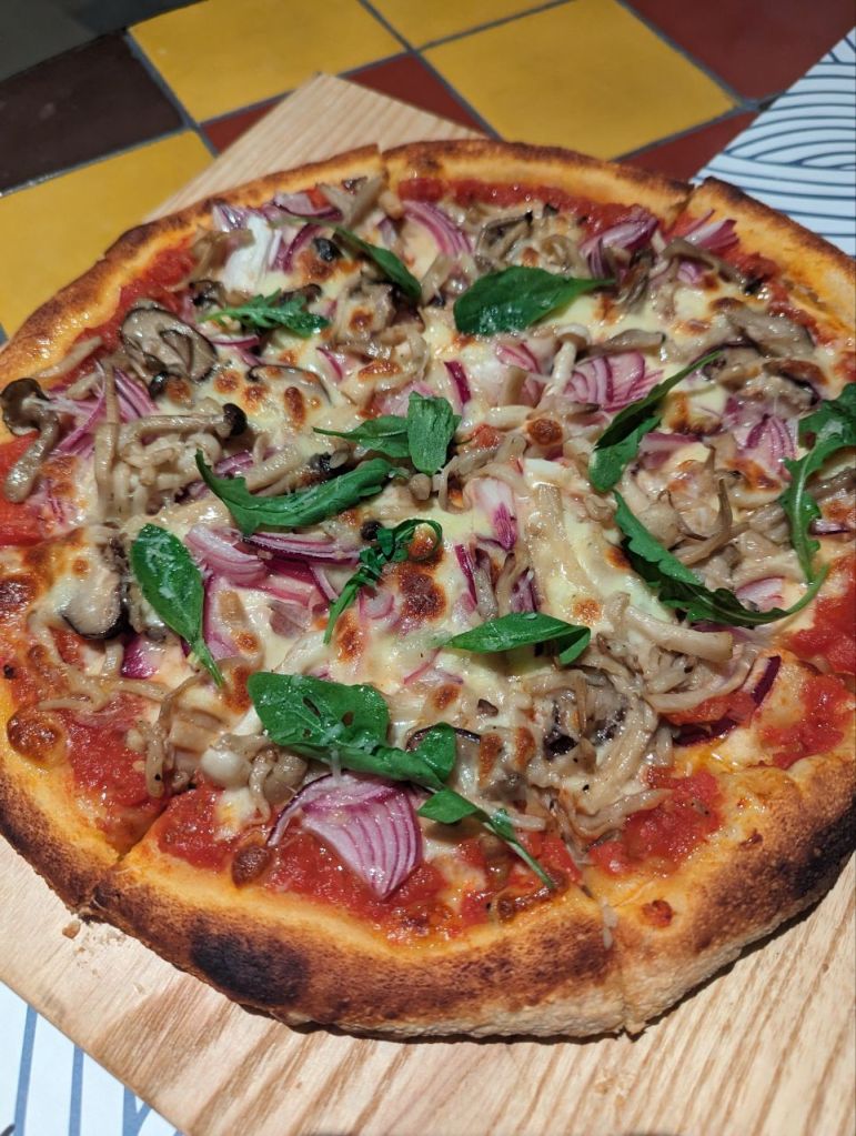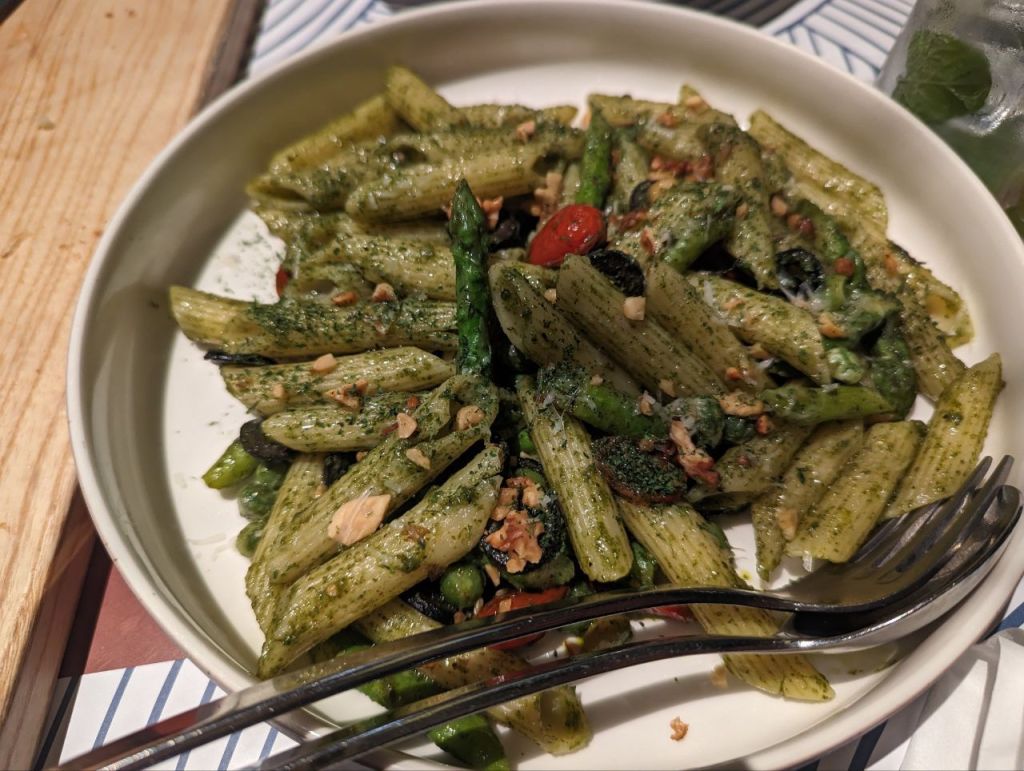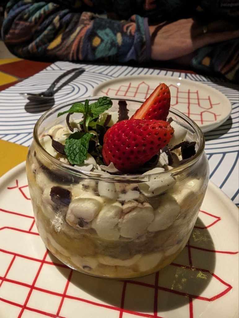 Abends laufen wir wieder zum gestrigen Restaurant. Heute gibt es eine Pilzpizza für Fabi und Pestonudeln für Mira. Zur Nachspeise ein Stracciatella-Bananen-„Tiramisu“.