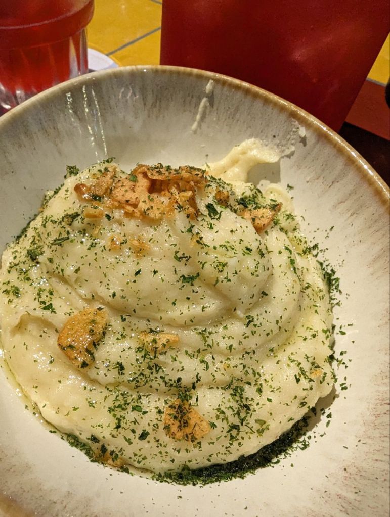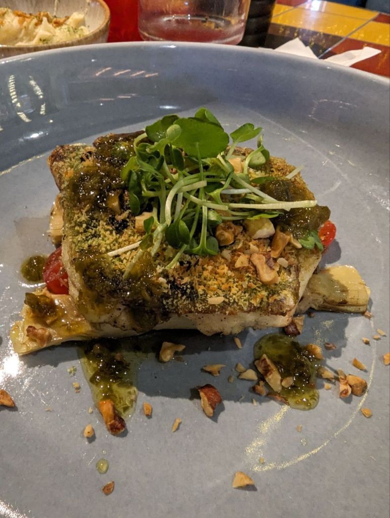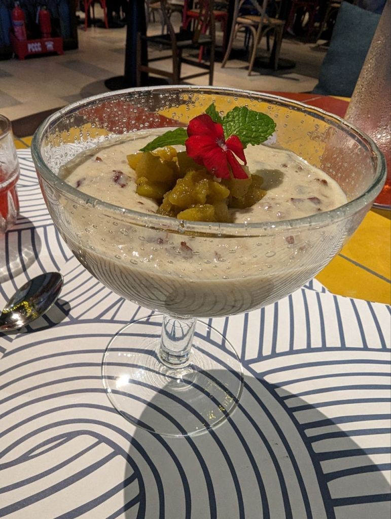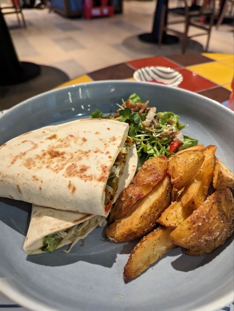 Wir trinken einen Beereneistee. Fabi isst eine gefüllte Piadina und Mira „Lachs“ mit Artischocken und… Kartoffelbrei. Yam. Zum Nachtisch gibt’s eine Art Milchreis.