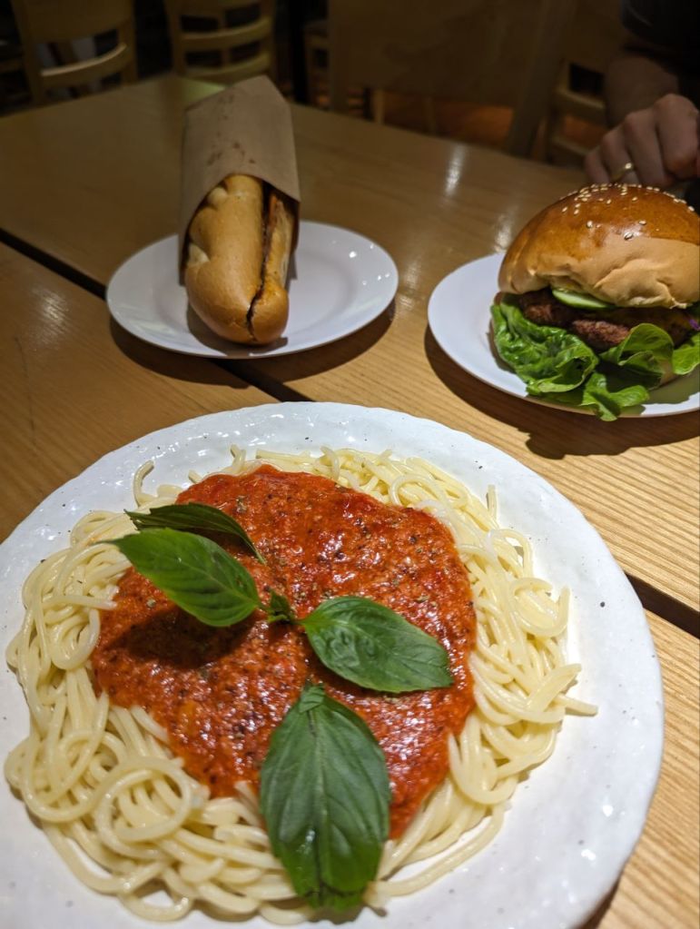 Danach suchen wir Essen. Wir finden ein veganes Restaurant. Spaghetti Bolognese für Mira, Burger für Fabi und zusätzlich ein Banh Mi. Schmeckt alles okay, die Bolognese schmeckt nach viel, aber nicht ansatzweise nach Bolognese oder Tomaten. Einen Versuch war’s wert.