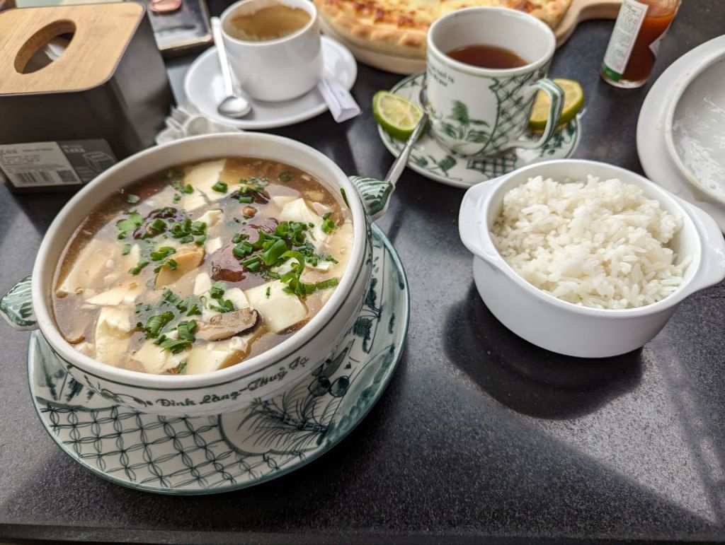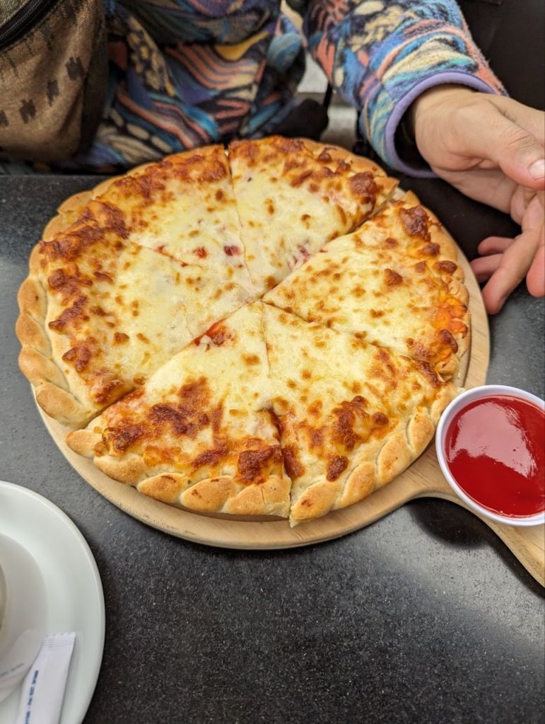 In einem Restaurant am See kehren wir ein und trinken einen Tee und Kaffee. Fabi isst eine Pizza und Mira Pilzschleim mit Tofu. Beides schmeckt nicht besonders gut.
