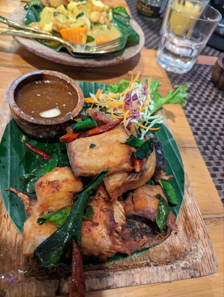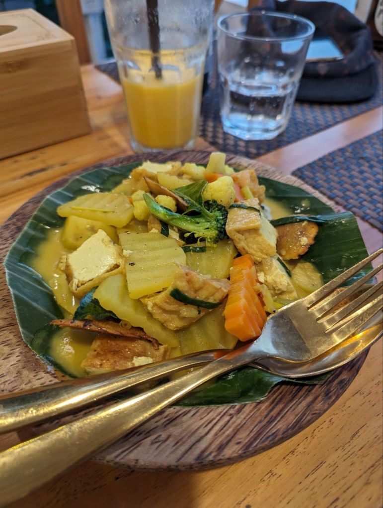 Zum Abendessen finden wir ein Restaurant am Mekongufer und genießen noch den Sonnenuntergang. Es gibt Bier, Sprudelwasser, Mangosaft, Veggie Curry, Sticky Reis, frittierten Mekong Fisch und Mekong Seegras mit scharfer Soße. Ganz lecker.
