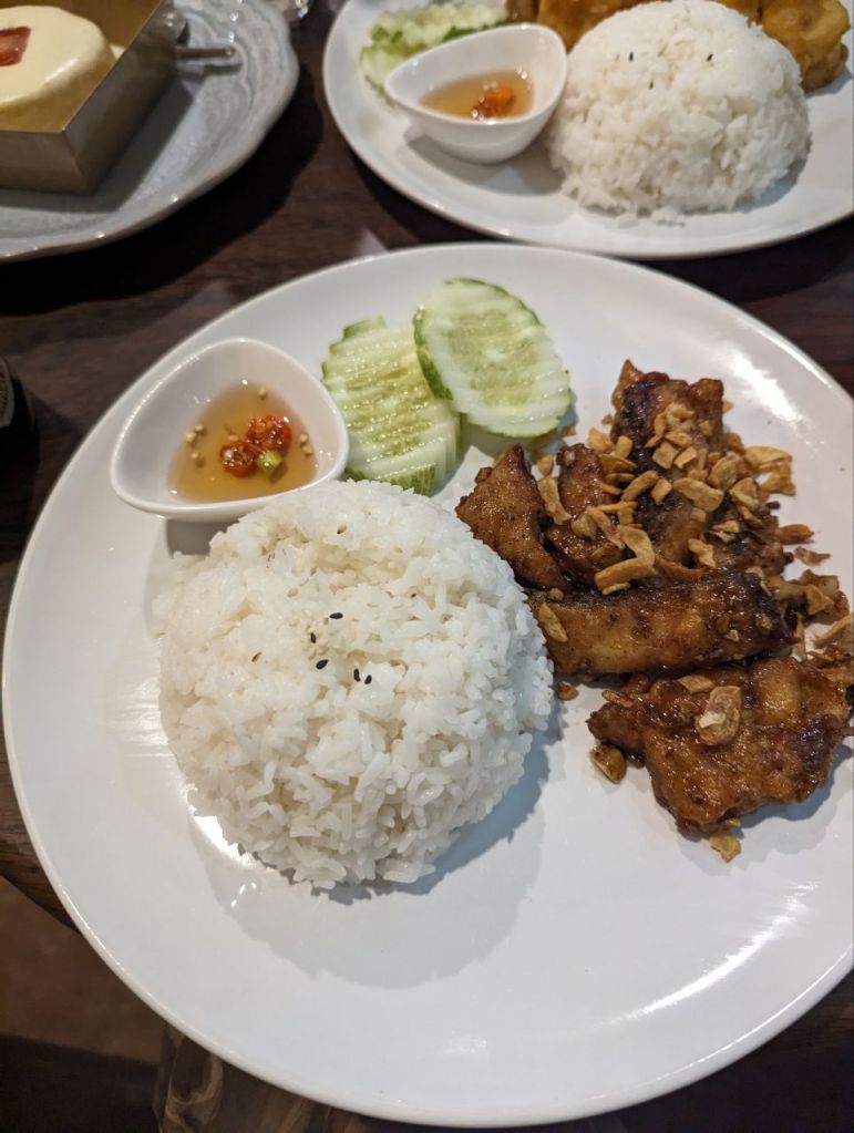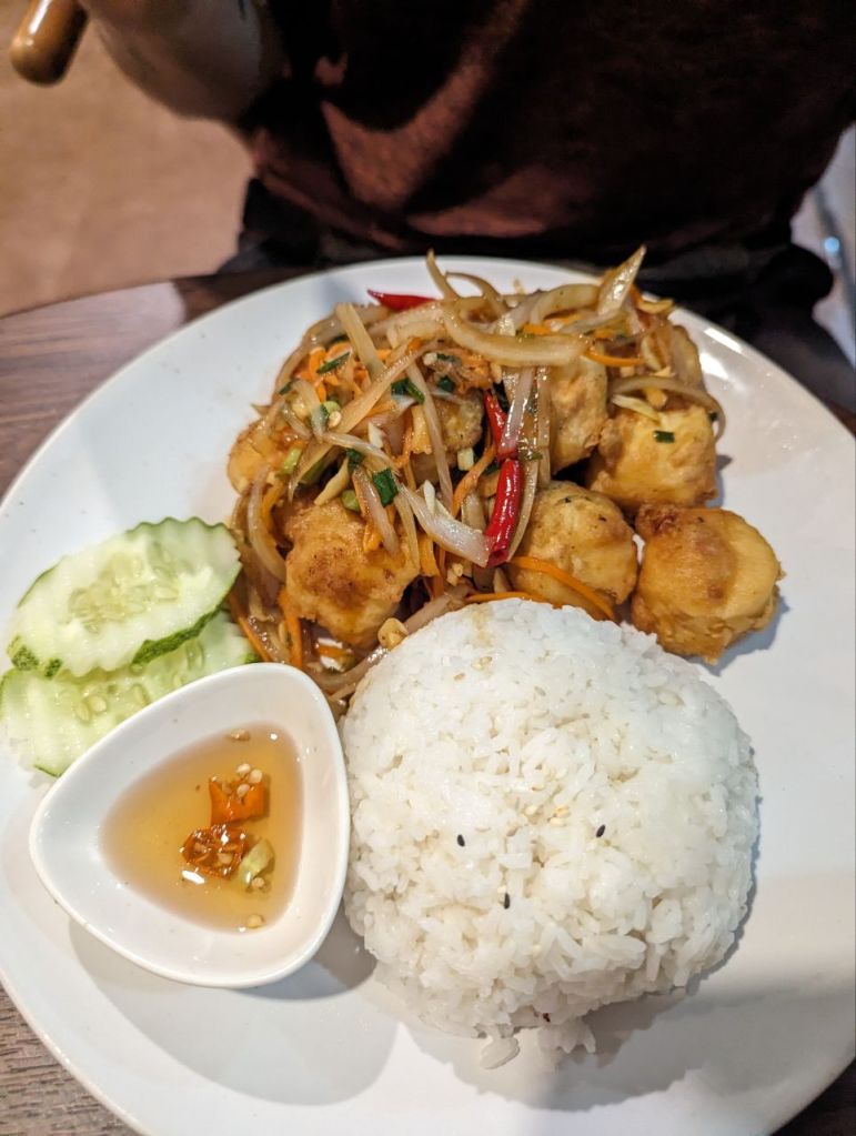 Zum Essen finden wir noch ein Restaurant ums Eck, Reis mit Eggtofu und Fisch.
