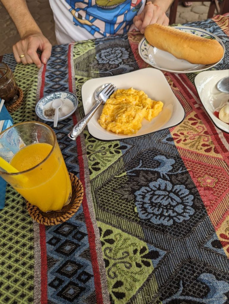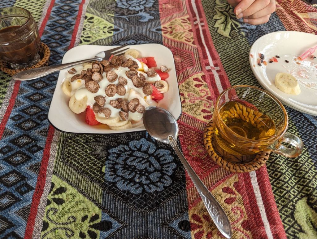 Der Tag beginnt entspannt, Frühstück, viel Obst und scrambled eggs.