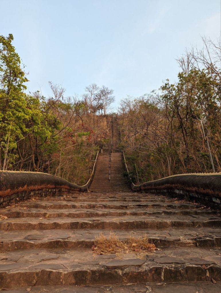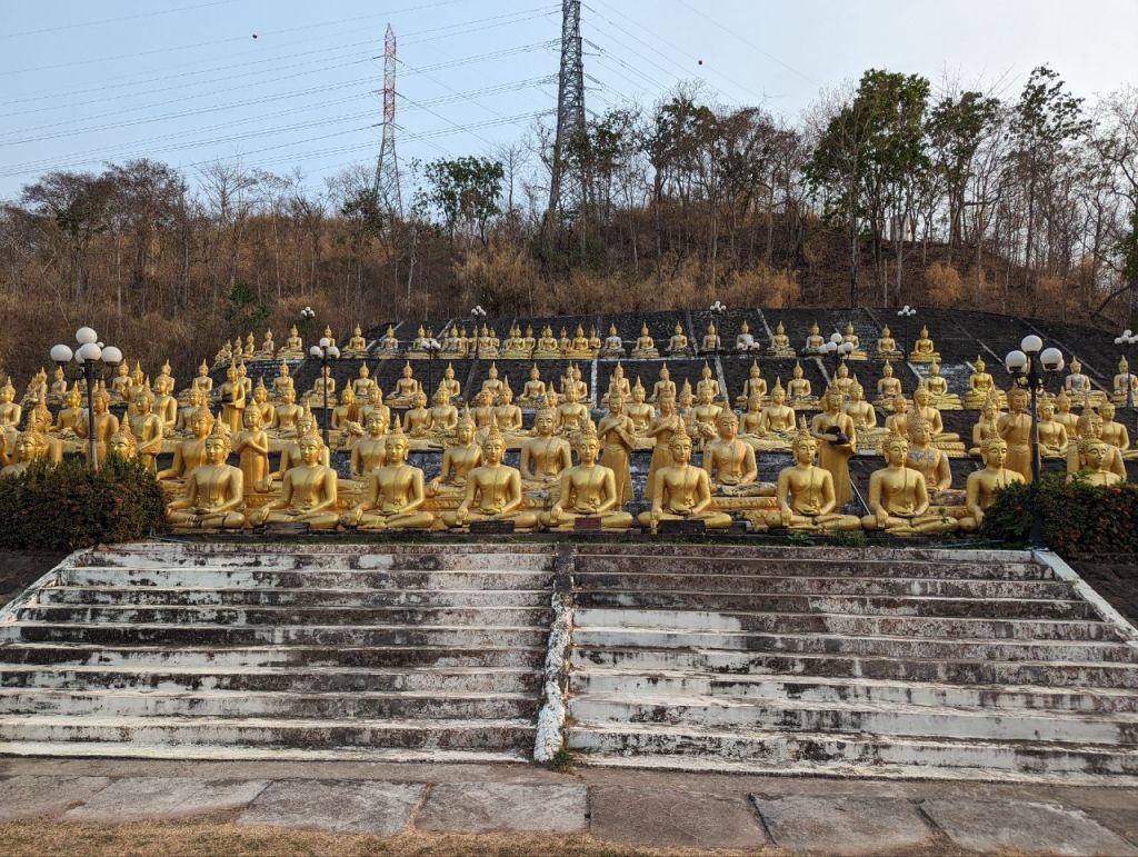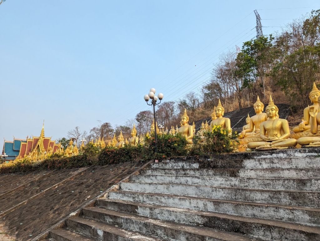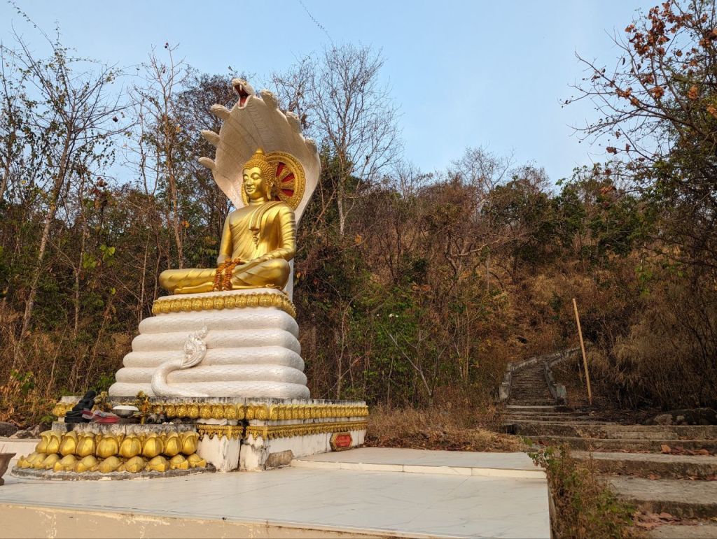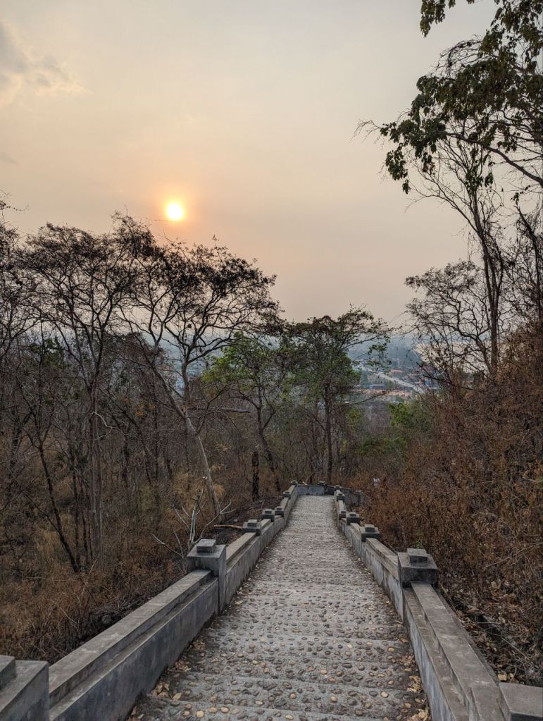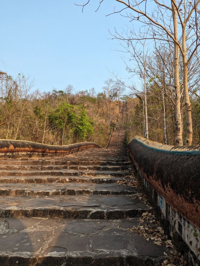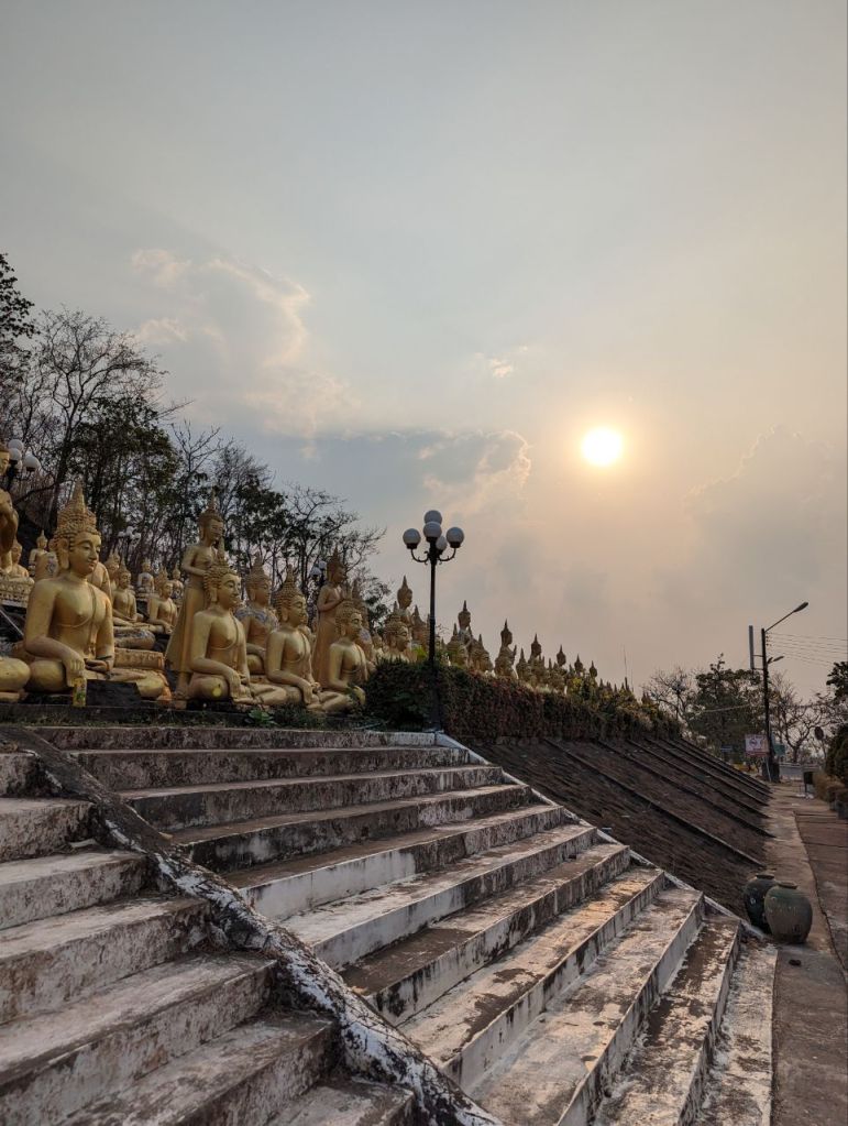 Hier geht’s ca. 300 m ein „paar“ steile Stufen zum Tempel und der riesen Buddha Statue hoch. Es ist immer noch sehr warm und wir schwitzen gut, aber die Aussicht lohnt sich. Der Beginn des Sonnenuntergangs ist toll.