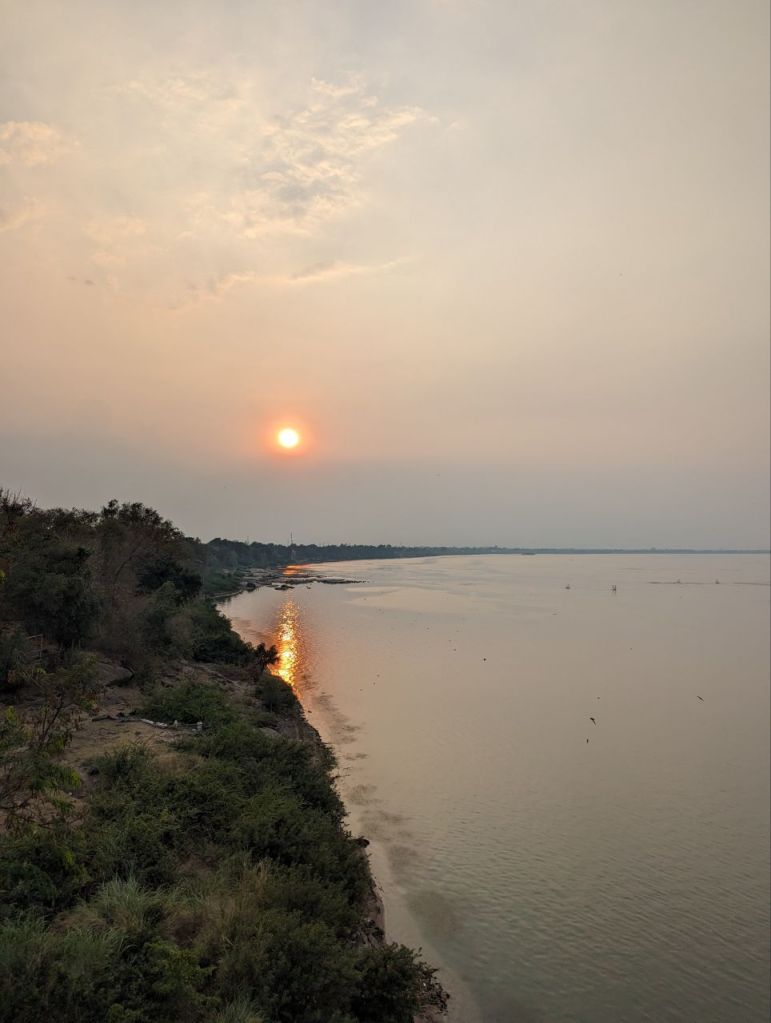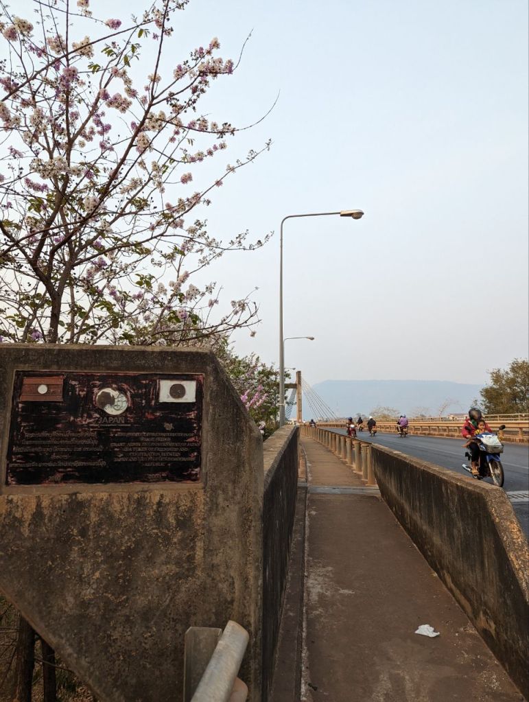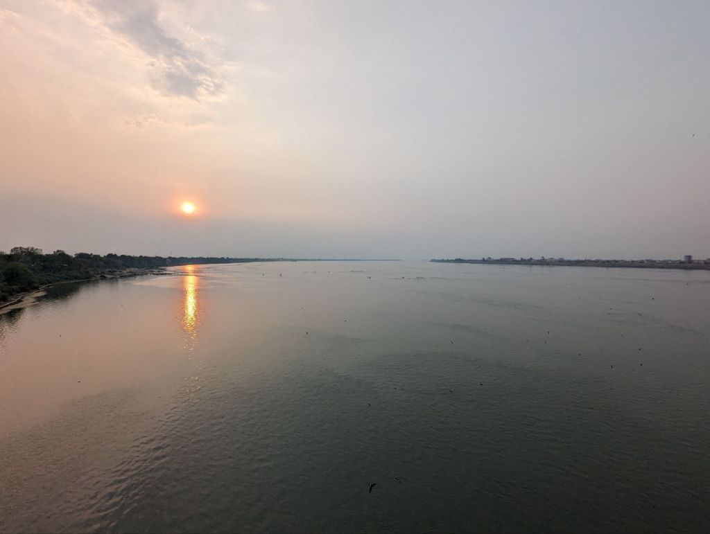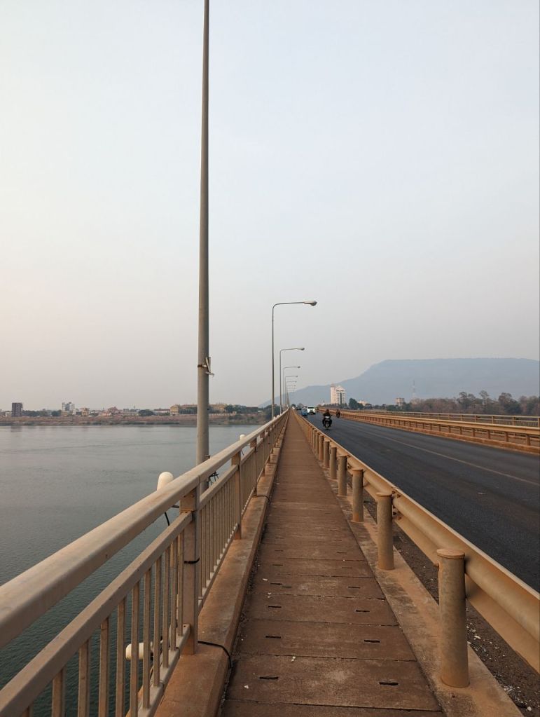 Wir laufen die ca. 3 km zurück über die Brücke in die Stadt. Unsere bisher längste „zu Fuß“ Brücke (ca. 2 km). Der Sonnenuntergang über Mekong ist einzigartig.