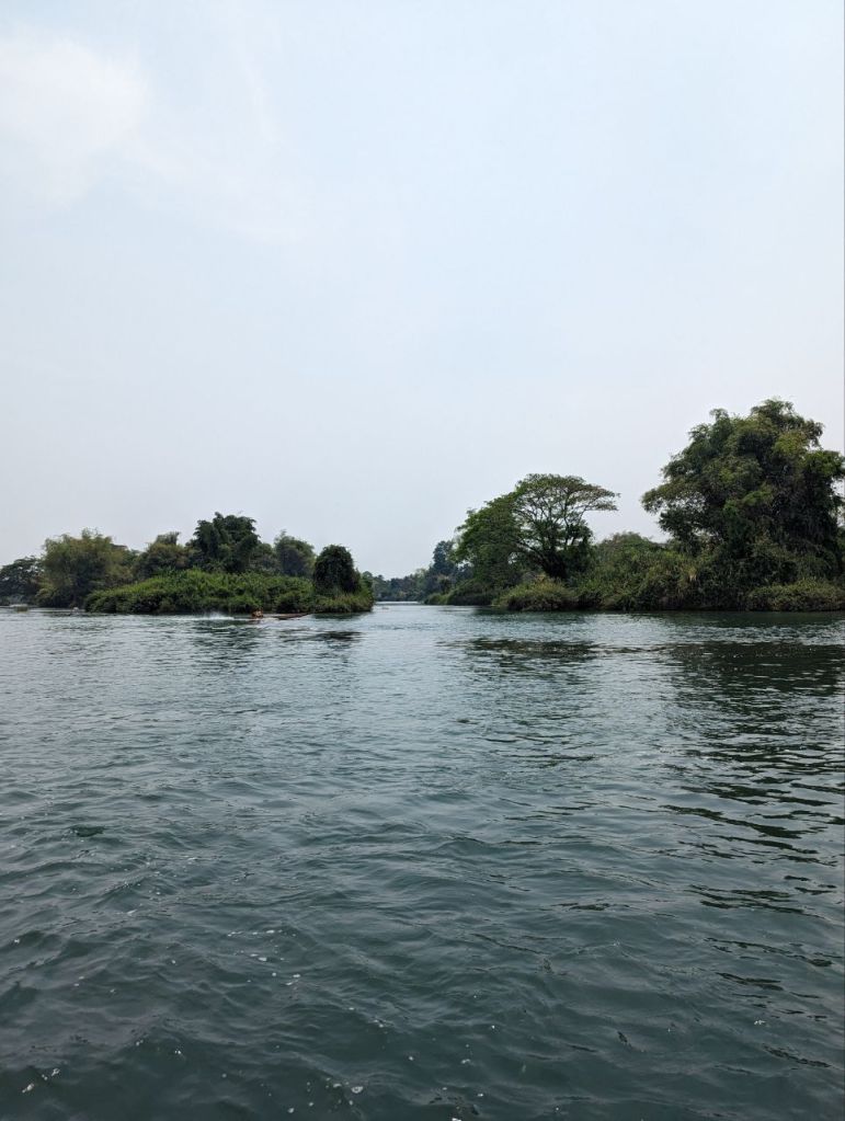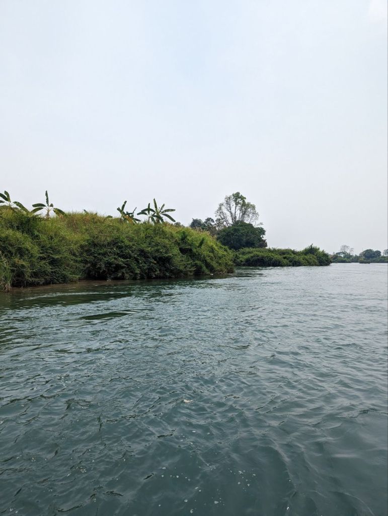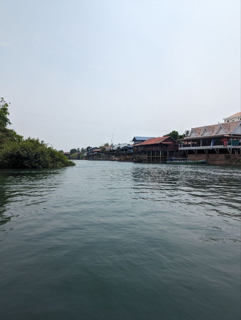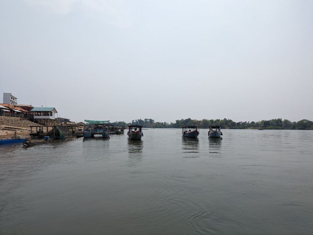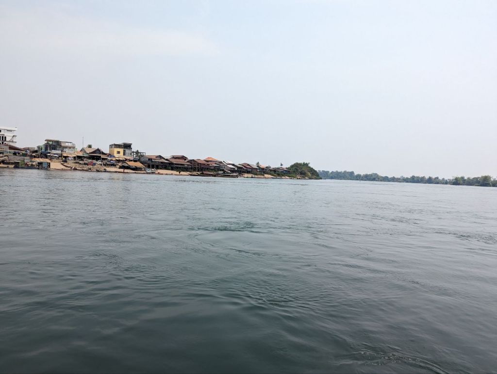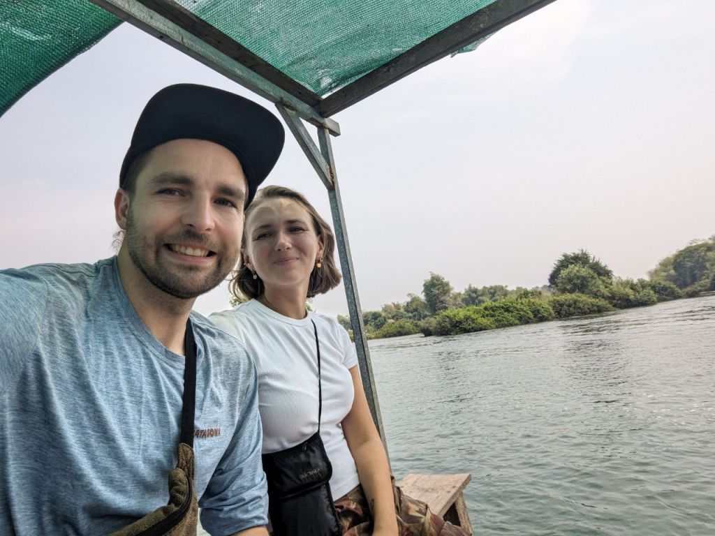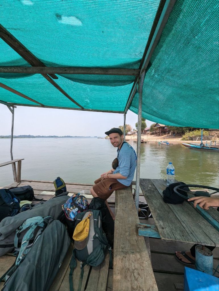 Ein klappriger zusammengeschraubter Katamaran bringt uns über den Fluss zur Insel Don Det.