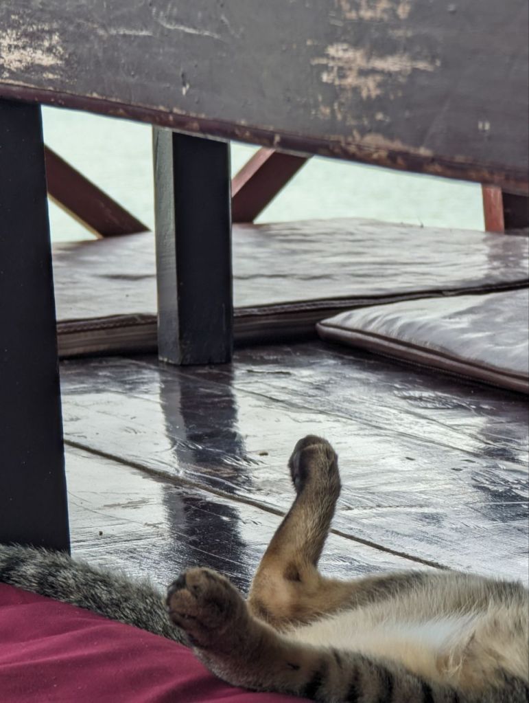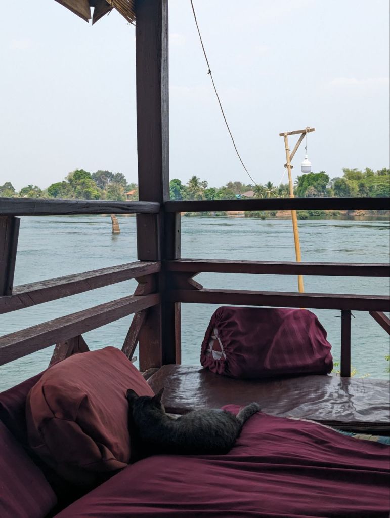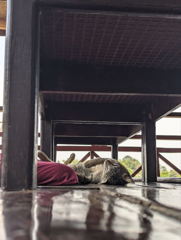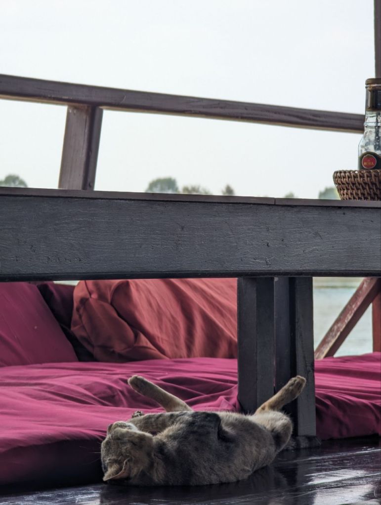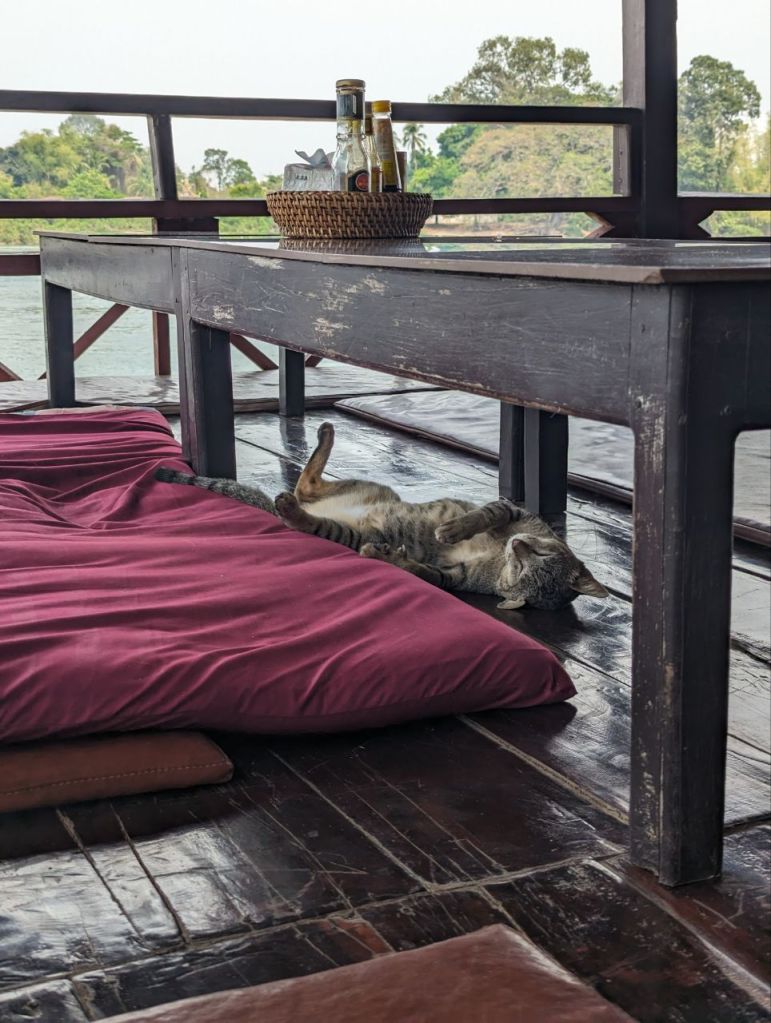 Wir gönnen uns ein Mittagessen und sehr guten Green Lemon Ice Tea auf der Flussveranda. Nebenan döst die Hauskatze.