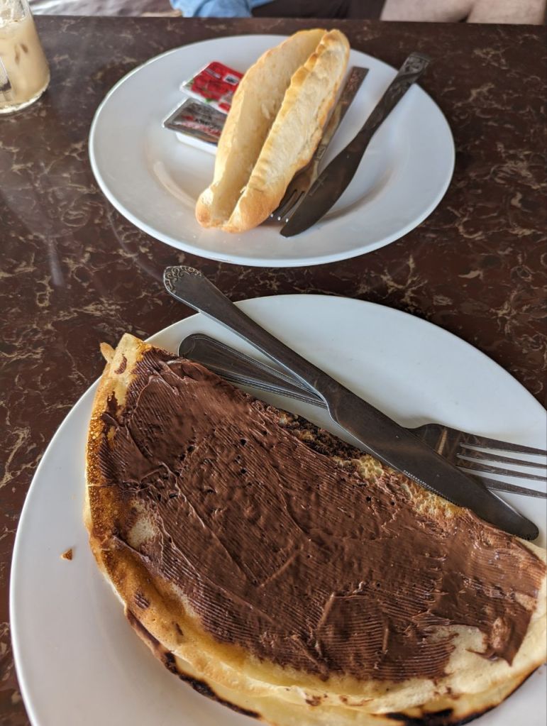 Frühstück mit Marmeladentoast und Schokopfannkuchen. Dazu Coconut Coffee und Iced Green Tea.