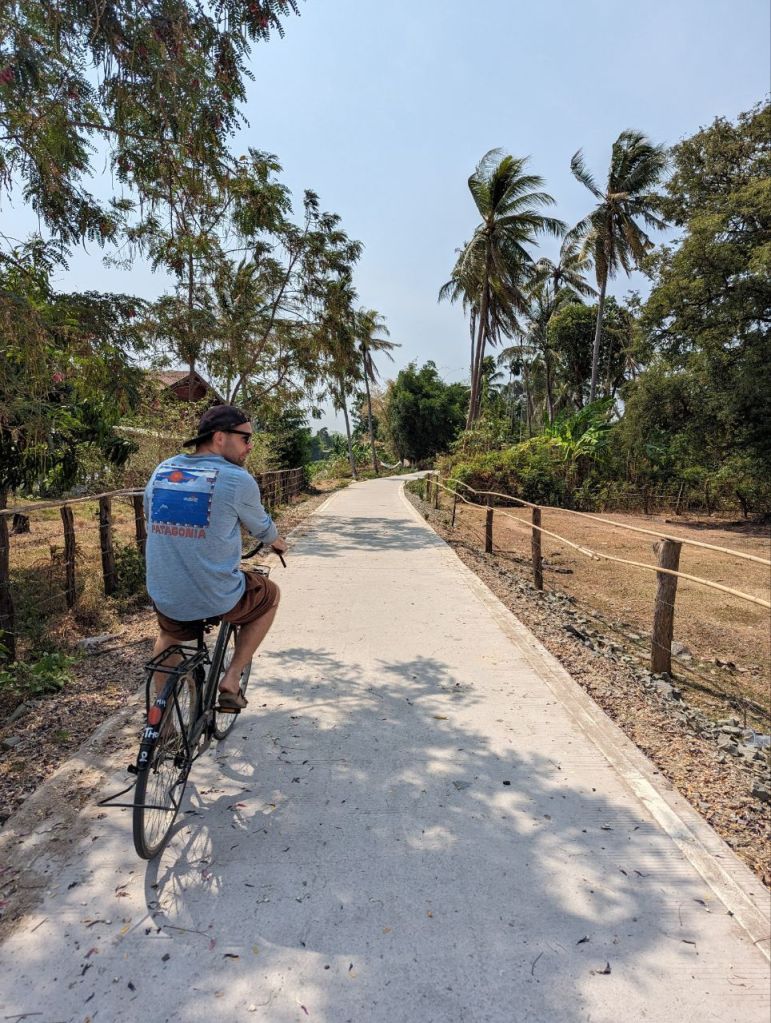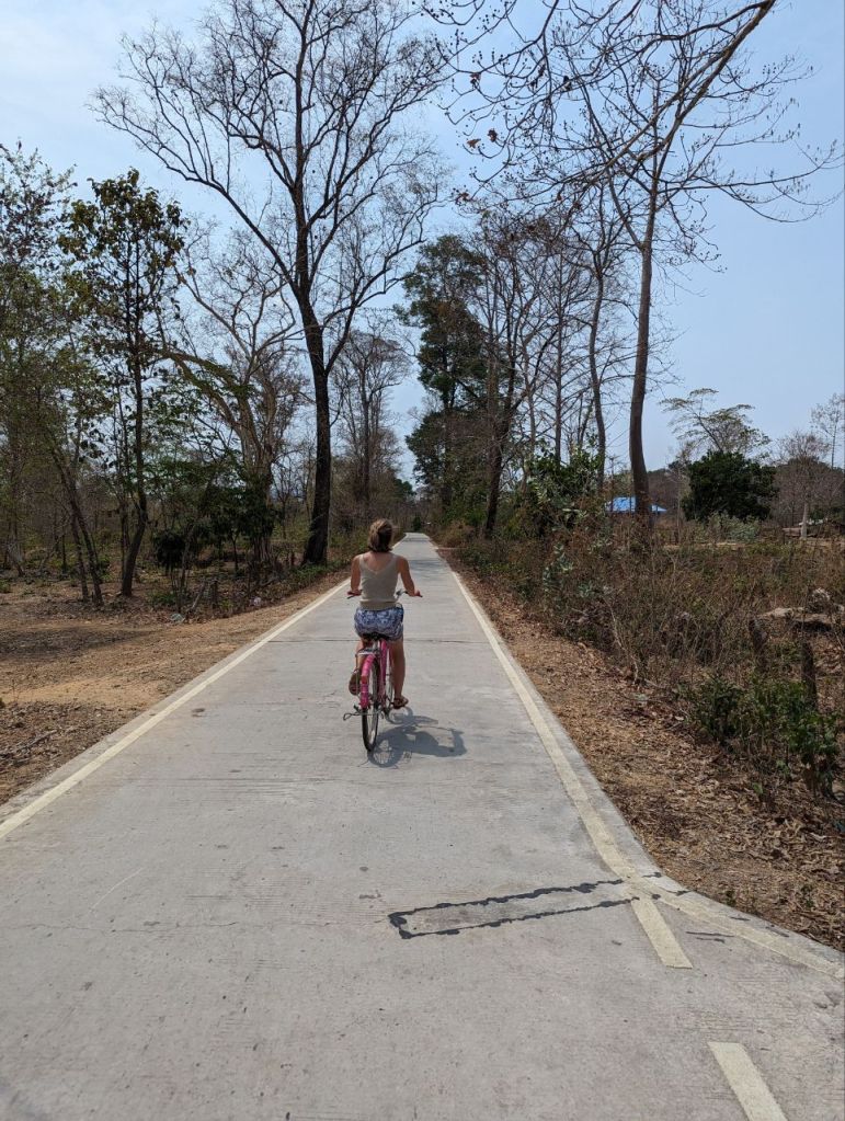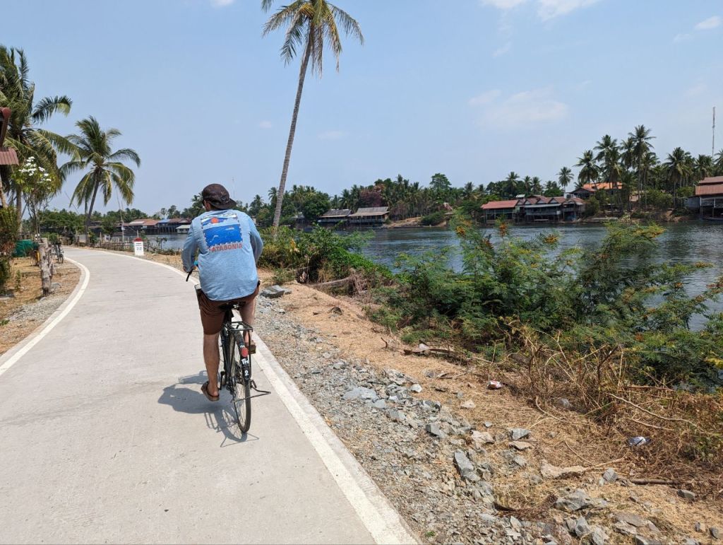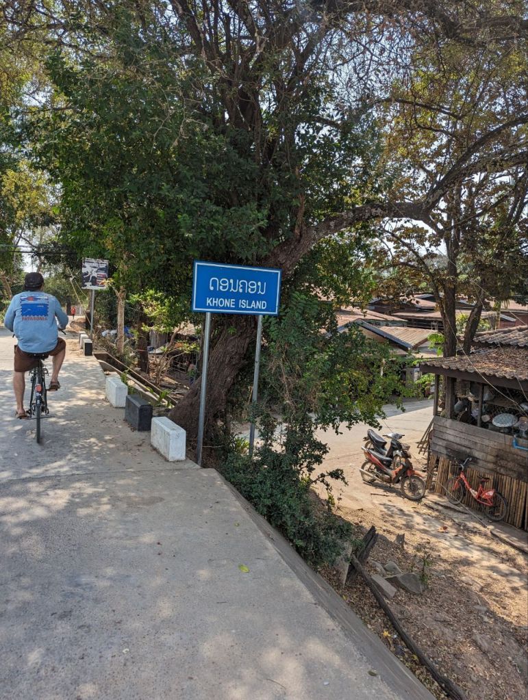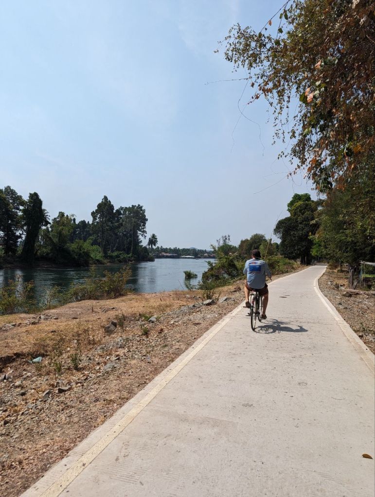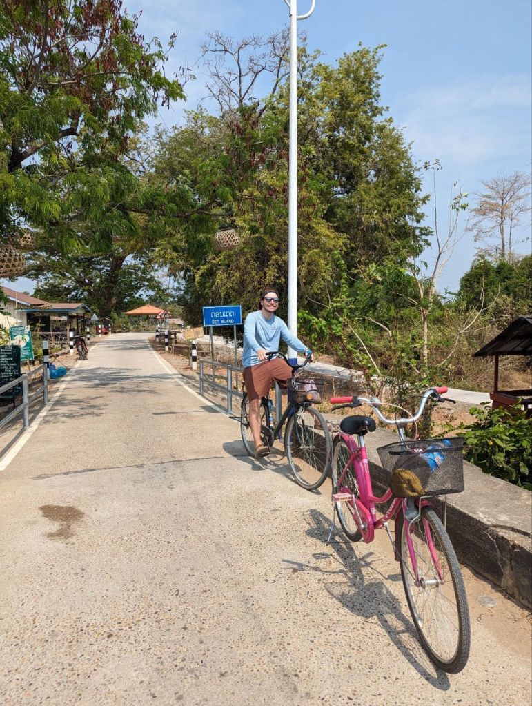 Dann leihen wir uns Fahrräder aus. Rosa für Mira, dunkelgrün für Fabi. Die Tour führt uns um die 20 Kilometer über die Inseln Don Det und Don Khon.