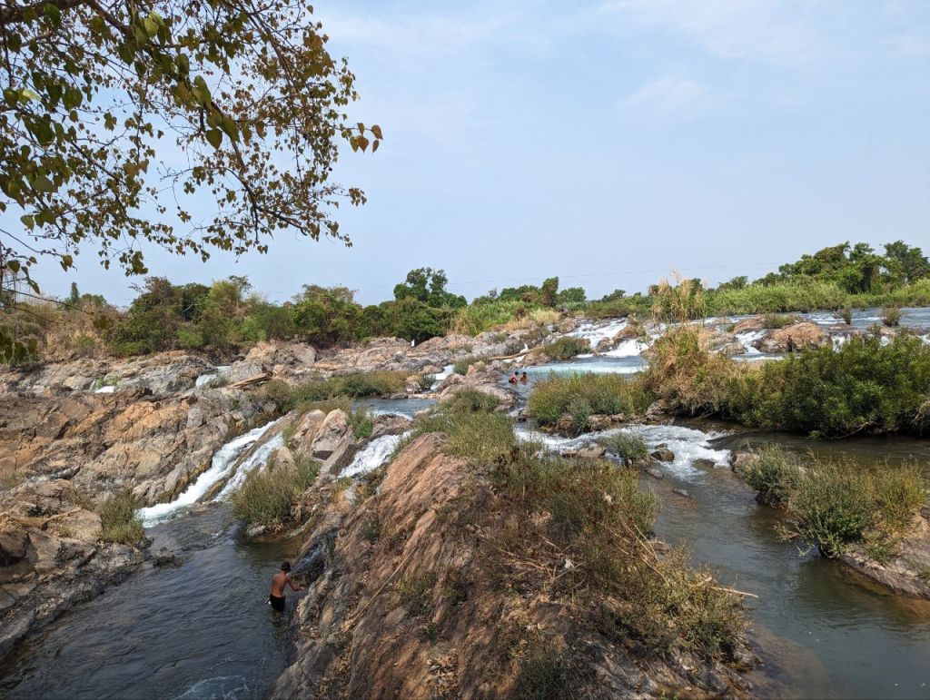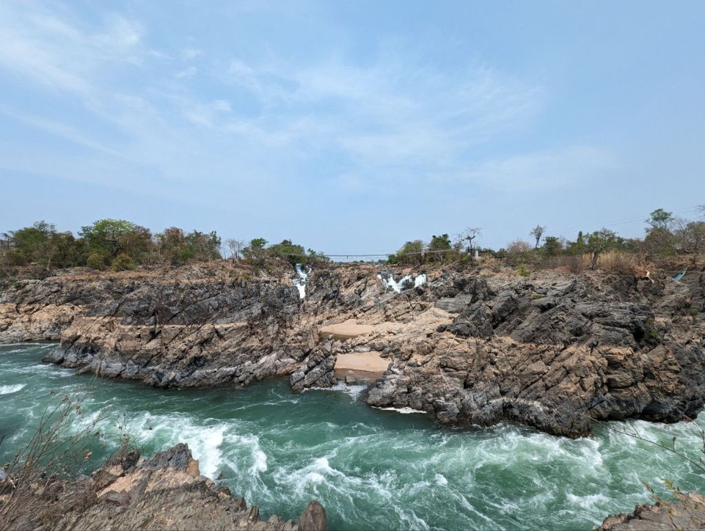 Wir biegen zum Li Phi Somphamit Wasserfall ab. Für 30.000 Kip bietet sich uns ein überraschend eindrucksvoller Anblick. Der Wasserfall ist größer als gedacht. Es ist sehr warm.
