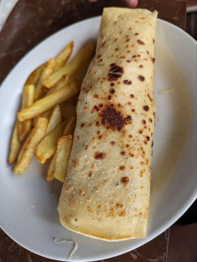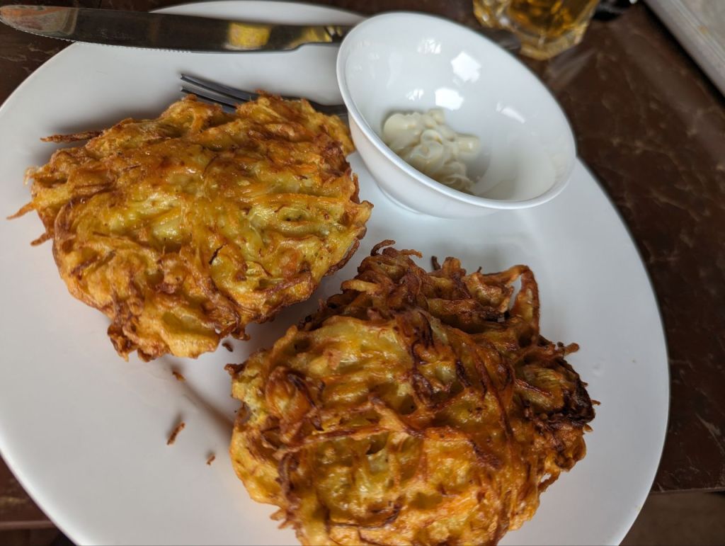 Uns tut ein bisschen der Popo weh. Zur Belohnung gibt’s Bier und Essen. Einen gefüllten Pfannkuchen und Gemüsepuffer.