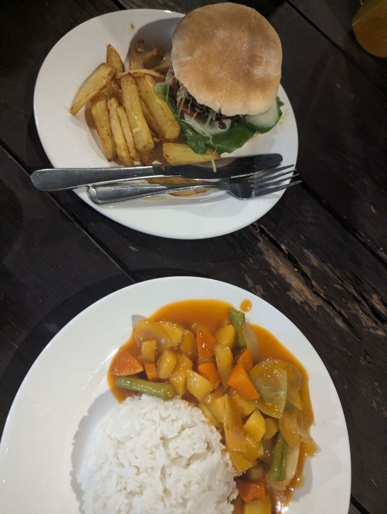 Abends essen wir im Restaurant des Resorts Red Fried Curry und einen wirklich guten Pumpkin Burger. Dazu Lemon Ice Tea. Wir beschließen auch, eine Nacht länger hier zu bleiben.