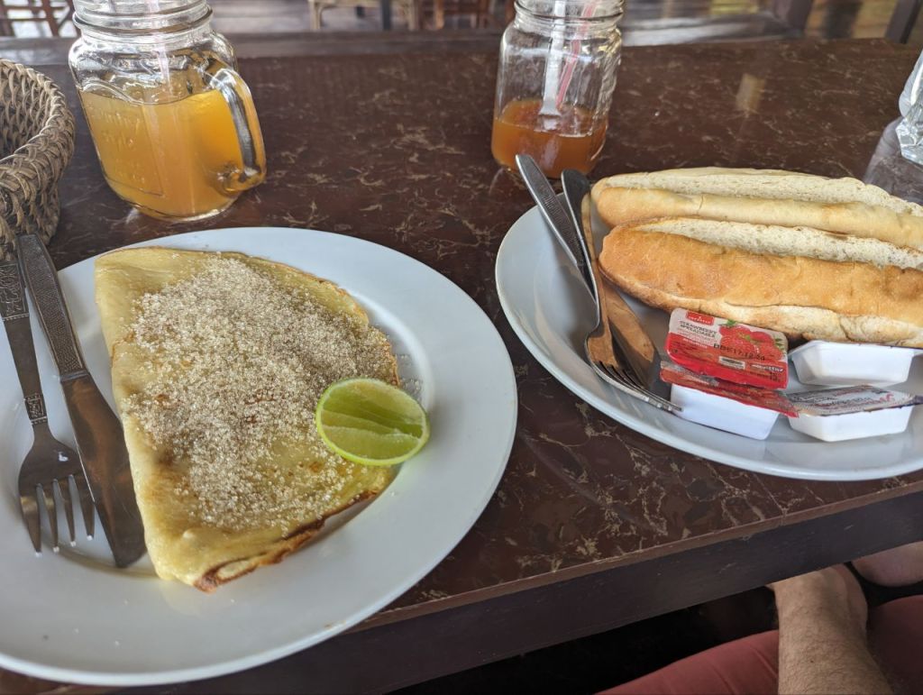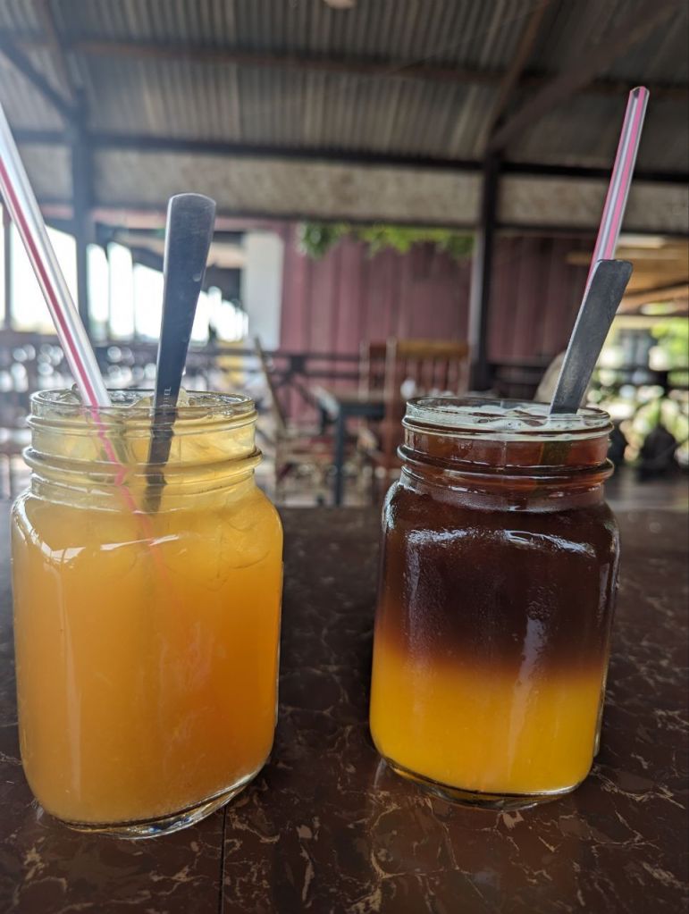 Spätes Frühstück, Marmeladentoast und Zitronenpfannkuchen. Dazu Lemon Ice Tea und Iced Orange Americano.