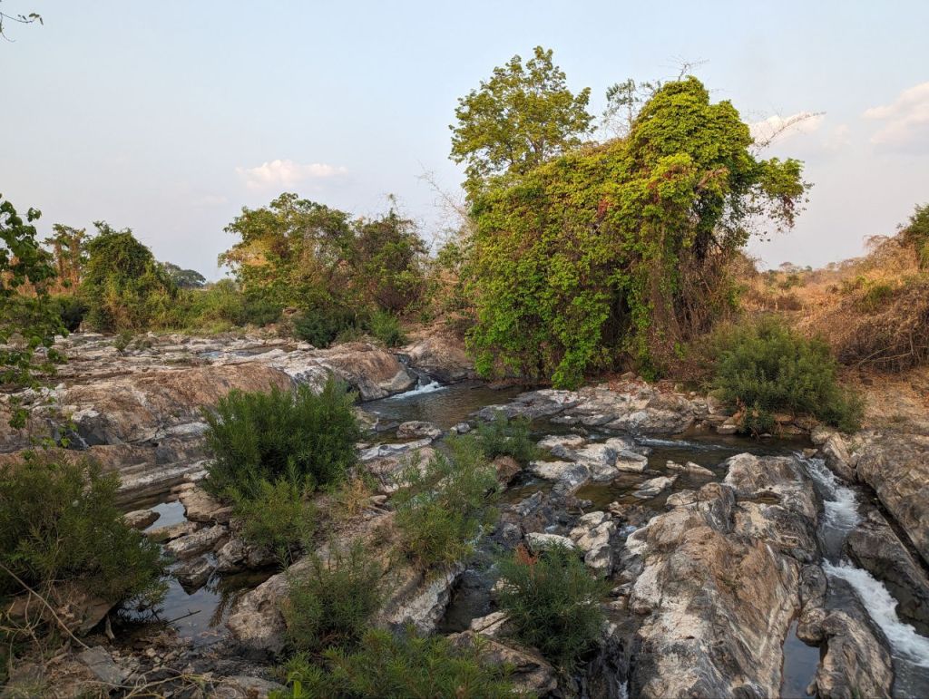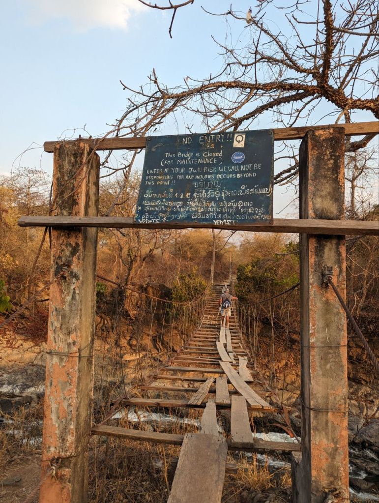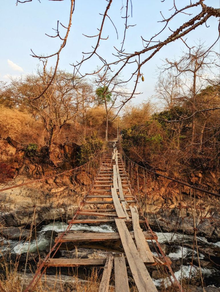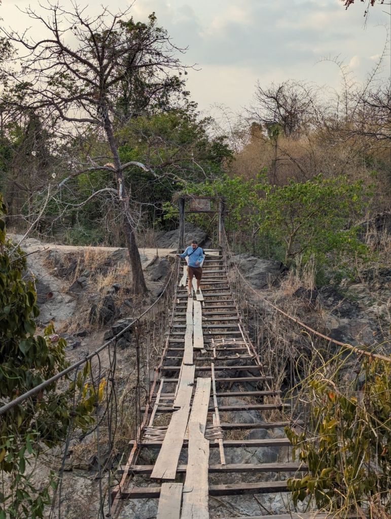 Über eine sehr baufällige Brücke geht es zum Wasserfall. Wir müssen uns ein bisschen durchs Gebüsch quetschen.