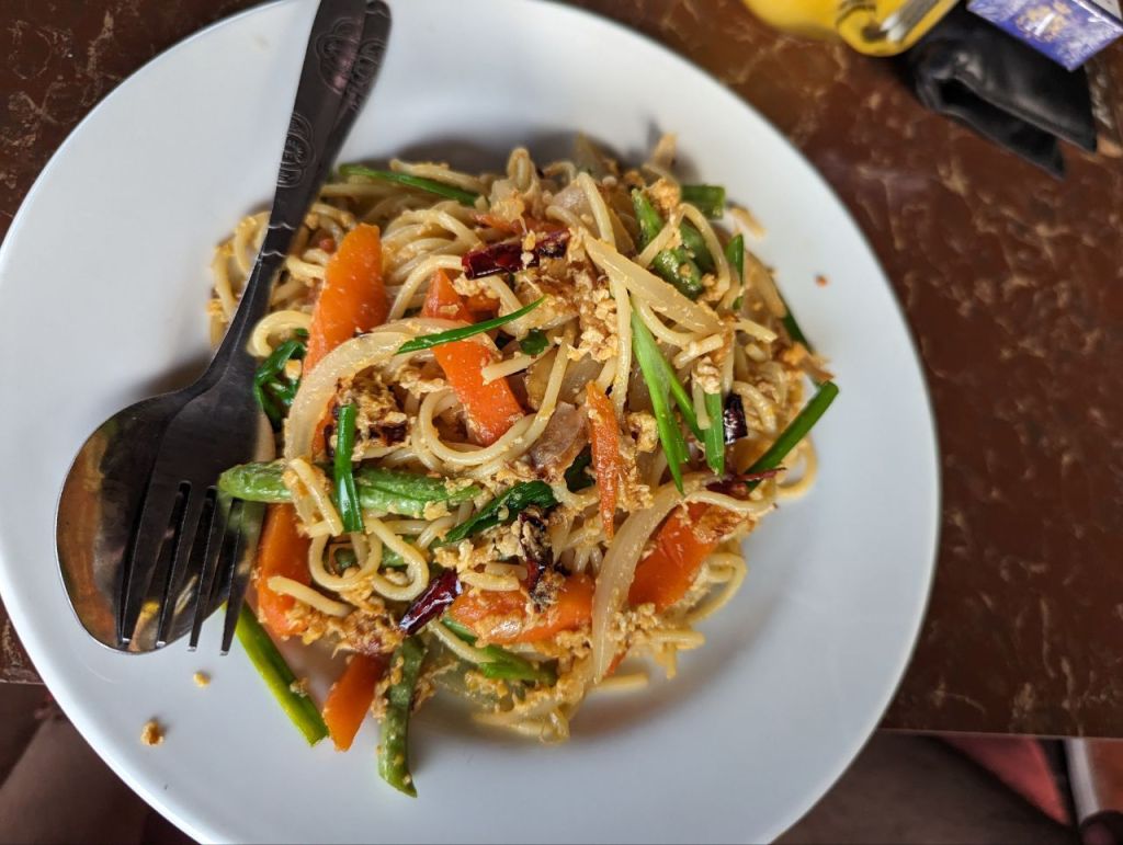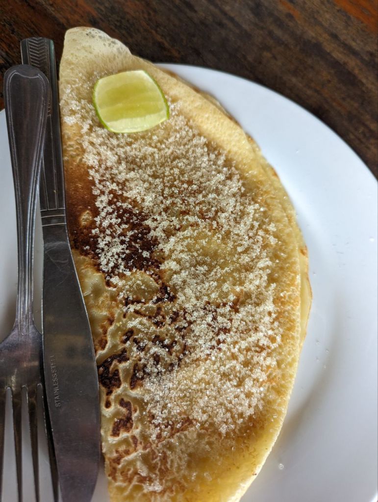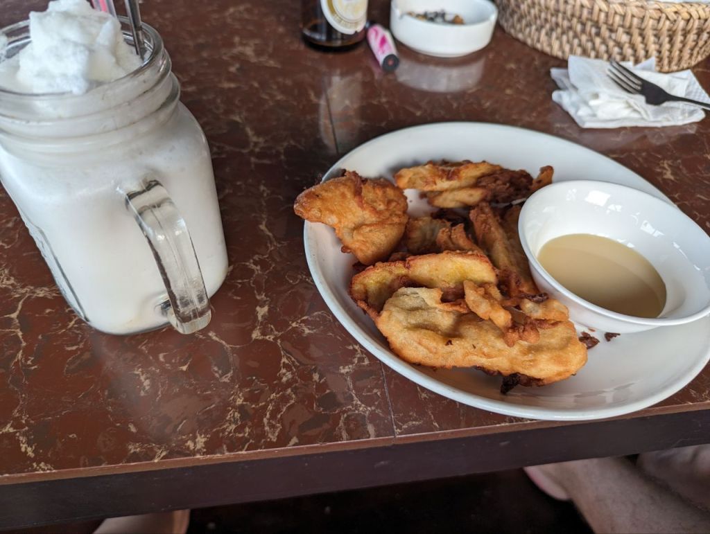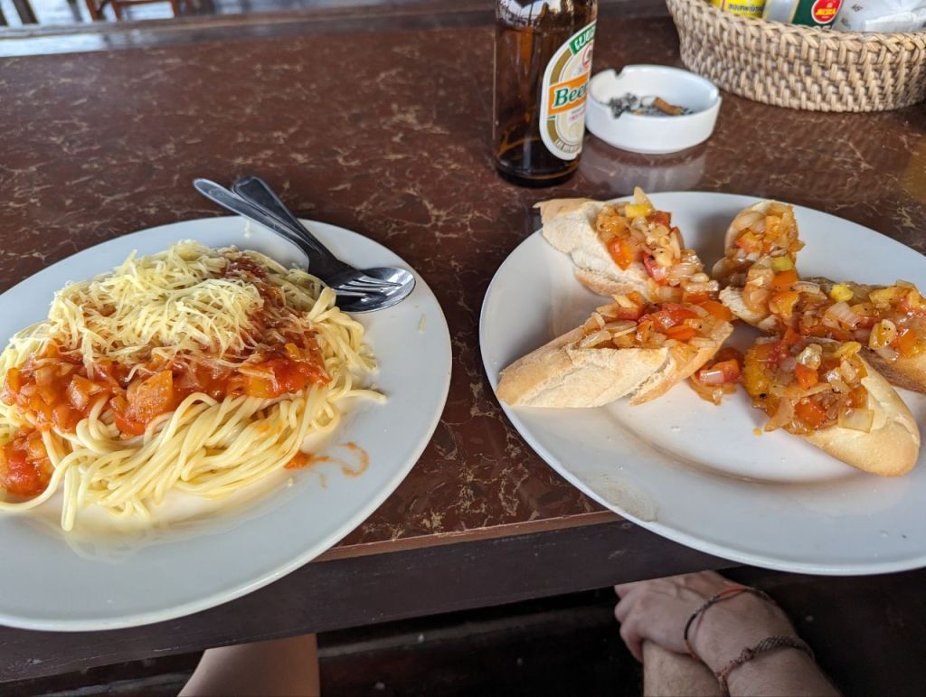 Shakes und Crepes zum Frühstück, dann entspannen und zum Abendessen Bruscetta, Nudeln und gebackene Bananen. Dazu Mango- und Kokosshakes.