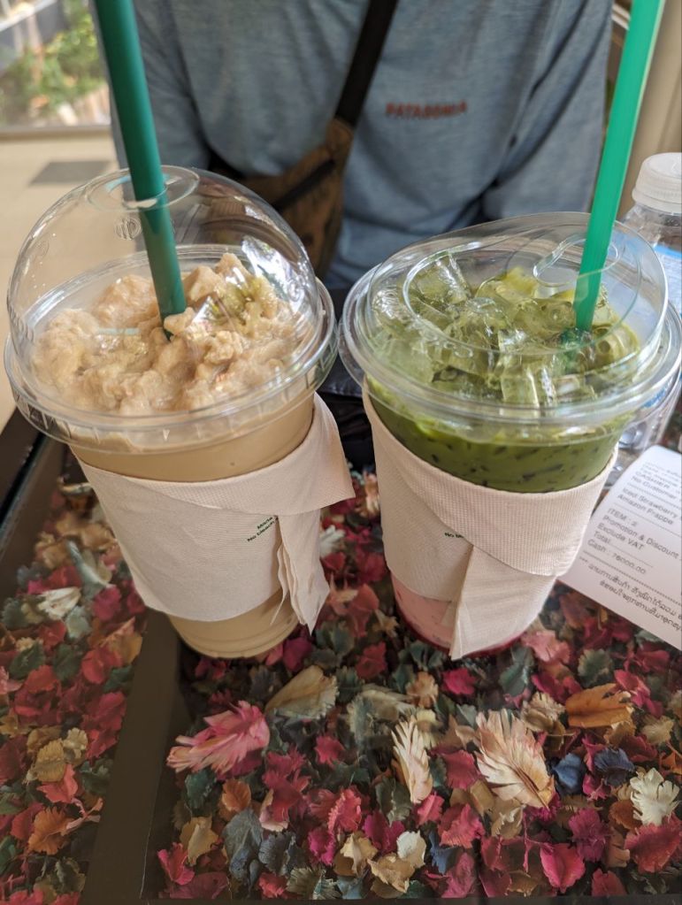 Morgens checken wir um 11:30 Uhr aus und gehen zuerst noch mal einen Kaffee/ Matcha bei Café Amazon trinken.